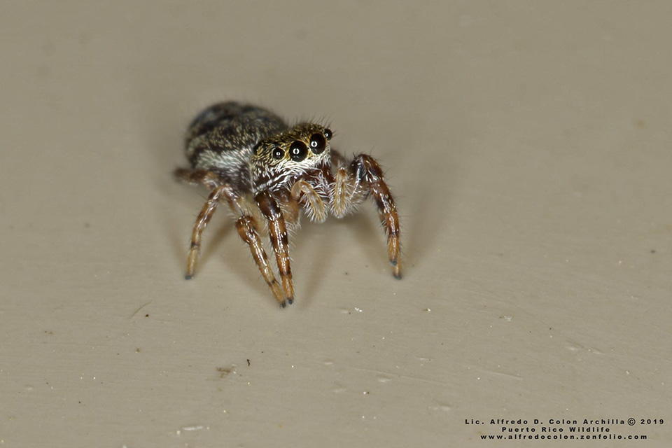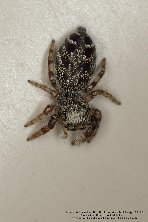 Jumping spiders are small to medium-sized spiders. The front part of the body (cephalothorax) is longer than wide and is not flat. The face is vertical. The jaws (chelicerae) are small. The anterior median eyes (AME) are huge and can be moved, giving the spider excellent vision. The posterior lateral eyes are far back on the head. The legs are short and hairy, and are not armed with prominent spines. |