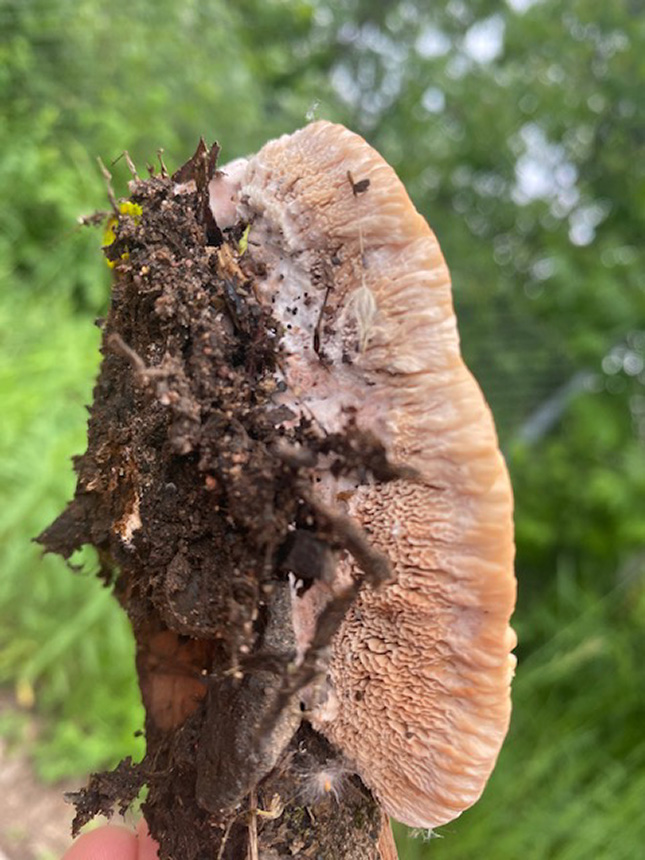 Blushing Rosette is a widespread, highly variable, ground-dwelling polypore. It occurs in Europe, Asia, Australia, southern Africa, and the Americas. In the United States, it occurs east of the Great Plains and west of the Rocky Mountains, with a few scattered records between. Blushing Rosette appears in summer and fall, alone or in groups but not clustered (gregarious). It grows on the ground around the base of both stumps and living deciduous trees, and occasionally around conifers. It gets its nutrients from dead and decaying wood. When found near a dead stump, it causes white rot in the dead wood. When found near a living tree, it is assumed to be growing on the roots, and it causes white trunk rot in the living wood. Blushing Rosette has two very different forms. This, and its worldwide distribution, has caused it to be described many times under many scientific names, with the result that today there are more than fifty synonyms for this species. The “normal” form takes the shape of a typical polypore, usually with a single cap, sometimes with multiple caps fused together into an overlapping rosette. The cap may be light brown, tan, reddish brown, or wine red. It is sometimes faintly concentrically zoned, and the margins are usually pale. It is usually 1¼″ to 3¼″ (3 to 9 cm) wide, but when growing alone it can be up to 8″ (20 cm) wide. It can be round, semicircular, or kidney shaped, or it can have an irregular shape, but it is always convex above and flat below (planoconvex). The upper surface is dry. It is usually densely or moderately covered with short, dense, matted, woolly hairs, but it is sometimes almost hairless. The pore surface is whitish to buff at first, but it becomes dingy with age, and it bruises pinkish to reddish brown or reddish to pinkish brown. When fresh, it sometimes exudes reddish droplets. The pores are 1⁄32″ to ⅛″ (1 to 3 mm) wide and up to 3 ⁄16″ (5 mm) deep. They appear stuffed at first, becoming angular, irregular, or maze-like as they age, and sometimes tooth-like on older specimens. The stalk may be well developed or poorly developed, or there may be no stalk. When present, the stalk is 1¼″ to 4″ (3 to 10 mm) long, and ⅜″ to 1¼″ (1 to 3 mm) thick. It may be laterally or centrally attached to the cap. It is hairy, colored like the cap, and often encrusted with dirt. The flesh is white, pinkish, or pale tan. The edibility is unknown, but it is too tough to eat. The spore print is white. The “aborted” form is an irregular mass of pore surface. It may have a single cup-like shape, or it may be cauliflower-like, with numerous separated, rounded projections. |
