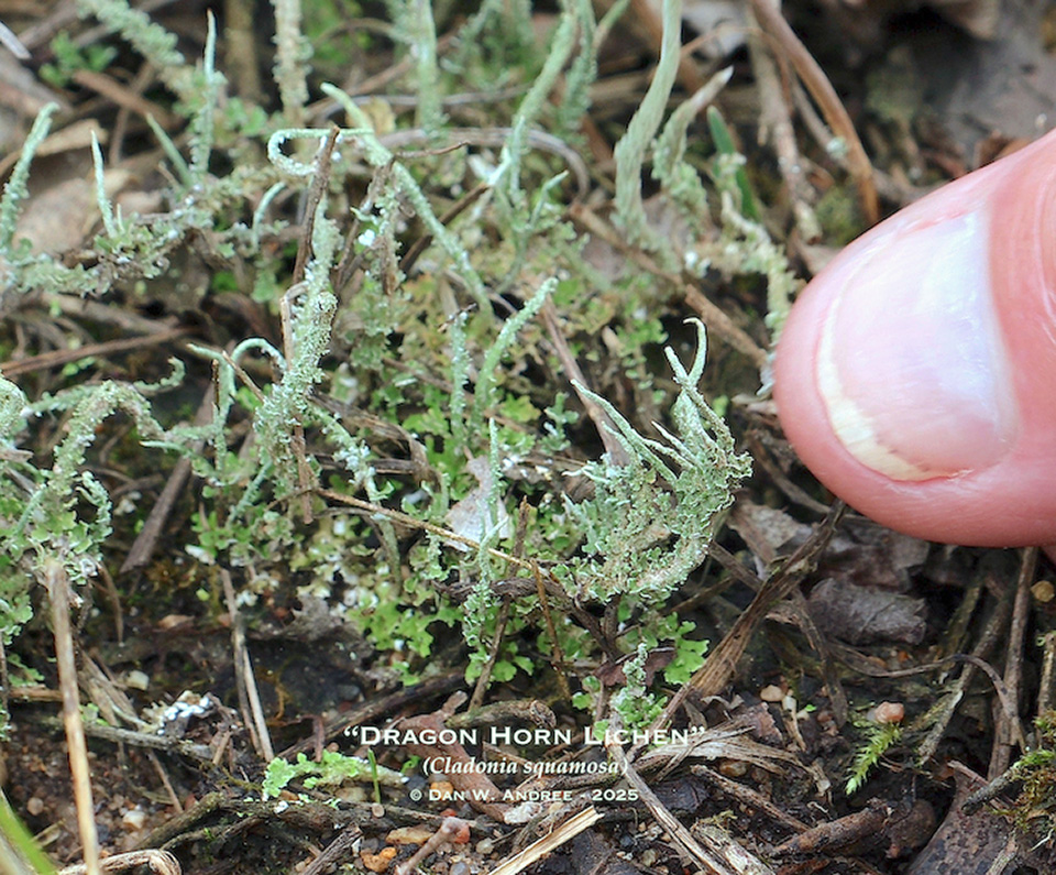 Dragon Horn produces two types of vegetative growth (thallus). The primary thallus is a leaf-like scale (squamule) that lies on the soil. The squamules are numerous but often small and inconspicuous, 1⁄16″ to ¼″ (2 to 6 mm) long, and 1⁄32″ to ⅛″ (1 to 3 mm) wide. The margins are deeply indented (incised) forming narrow, often coral-like lobes. The upper surface is light grayish green and the lower surface is white. The squamules form dense mats and they are persistent, remaining as the secondary thallus matures.