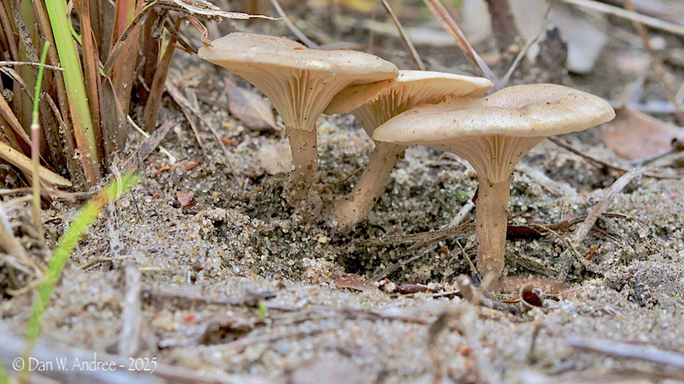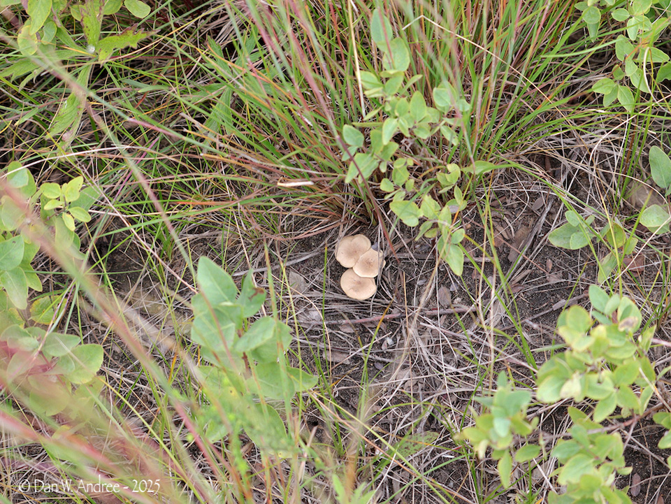 … here is another mushroom species I found recently. They were small which is best shown in the distant image of the group of 3 mushrooms. Interesting almost fan like gills underneath. Underneath images can be difficult particularly depending on where the mushrooms are located and vegetation and terrain. Also sometimes mosquitoes are around. But one does get a different perspective and view from down there. I like how the gill area widens upwards in an almost V or fan shape. |