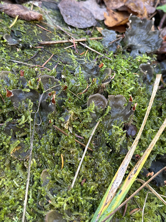 To help identify lichens, specialists perform spot tests by applying a drop of common chemical reagents to the surface. Many lichens show a distinctive color change—their unique “chemical fingerprint.” However, Many-fruited Pelt Lichen does not react to any of the standard tests, including the crucial P-test, meaning it shows no color change when the chemicals are applied.