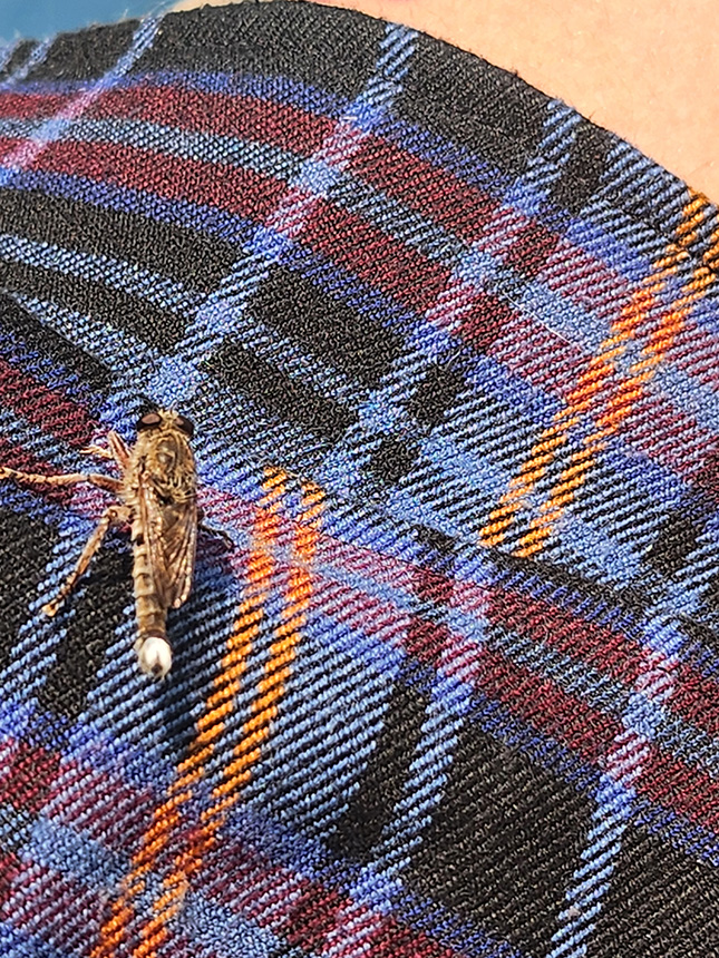 False bee-killer is a large robber fly. It occurs in the United States east of the Great Plains and in adjacent Canadian provinces. It is most common in the southeastern states. It is uncommon in Minnesota. Adults are 1″ to 1¼″ in length, the females a little larger than the males. The thorax is arched and stout. The abdomen is half cylindrical, rounded on top, flat below, widest at the base, and tapering to the tip. It is black above, brown below and on the sides. On the male there is a ring of white or yellow hairs at the rear margin of each of the first four or five abdominal segments, and a pair of white hair tufts above at the tip that can be easily seen when the male is in flight. There are two large compound eyes and three small simple eyes (ocelli). The compound eyes extend above the level of the top of the head (vertex), making the head appear hollowed out between the eyes when viewed from the front. They do not meet at the top of the head on either sex. The ocelli are arranged in a triangle on a prominent rounded projection (tubercle) in the middle of the head between the compound eyes. The upper face is covered with long, erect hairs. There is a dense mustache of long stiff bristles (mystax) on the face between the compound eyes at the lower margin, and a cluster of forward-directed bristles (a “beard”) on the lower part of the face. The hairs on the upper face, the mystax, and the beard are all yellow or yellowish-white. The antennae are short and have 3 segments. The third segment is elongated but is not subdivided by rings (annulated) and does not have a long bristle (arista). The legs are stout. The last part of the leg (tarsus), corresponding to the foot, has five segments. The last segment has 2 pads. On the wing, the anal cell is longer than the second basal cell and is closed near the wing margin. |