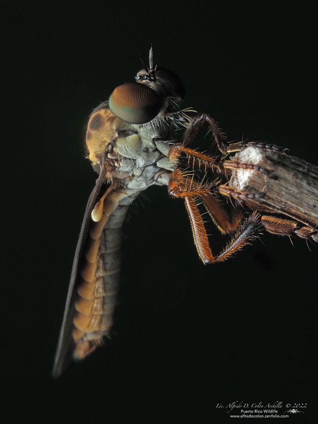 The head is brownish yellow in front, ash gray behind. It is much broader than the thorax, and it is strongly compressed from back to front. There are two large compound eyes on the side of the head and three small simple eyes (ocelli) in a triangle on top of the head. The top of the head is depressed (“hollowed out”) between the compound eyes. The compound eyes are relatively large and very widely spread apart. This feature distinguishes the genus Holcocephala from all other fly genera in the United States. Each compound eye is composed of numerous visual elements (ommatidia) with a hexagonal outer face (facet). The facets on the front of the eye are very large but gradually decrease in size approaching the upper, outer, and lower margins. The facets are black but have bright bronze reflections. The antennae are short, slender, and black. They have three segments. The first two segments are very short and rounded. The first segment is spindle-shaped, distinctly broader in the middle. The third segment is two times as long as the first two segments together. At the tip of the third segment there is a long extension (style). The style is well developed, nearly as wide as the third segment at the base and tapering to a sharp point at the tip.