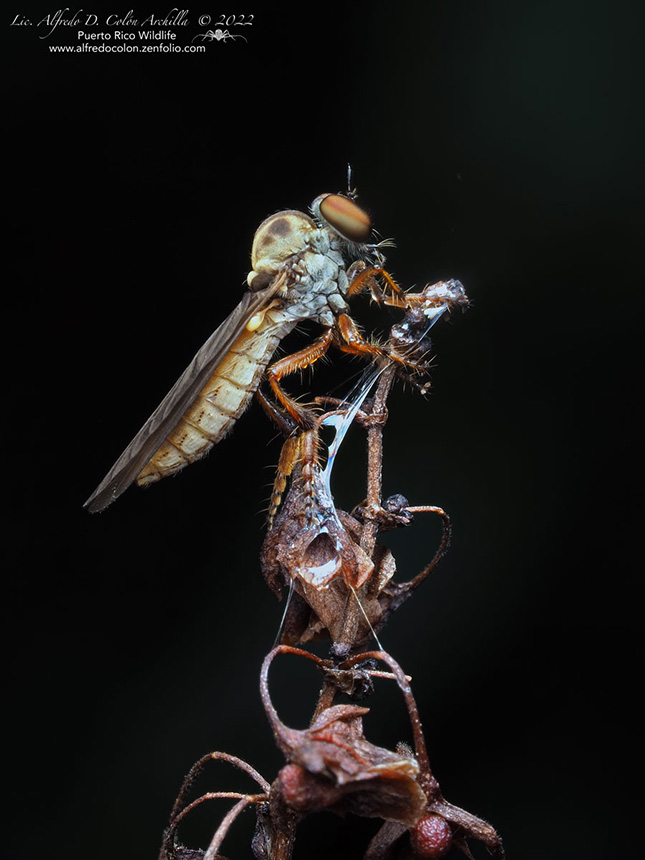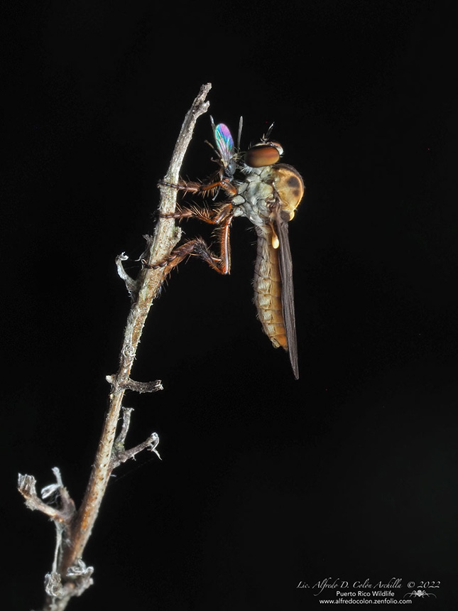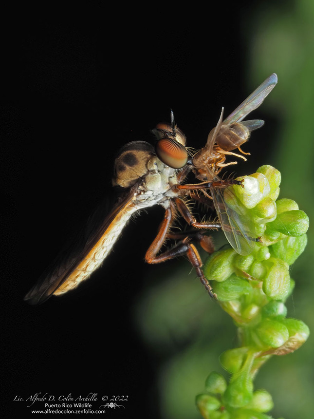 Golden goggle eye is a small gnat ogre. It occurs in North America from Quebec to Florida west to Minnesota and eastern Texas. Adults are found from early July to early September in damp, grassy, open areas near woodlands.
