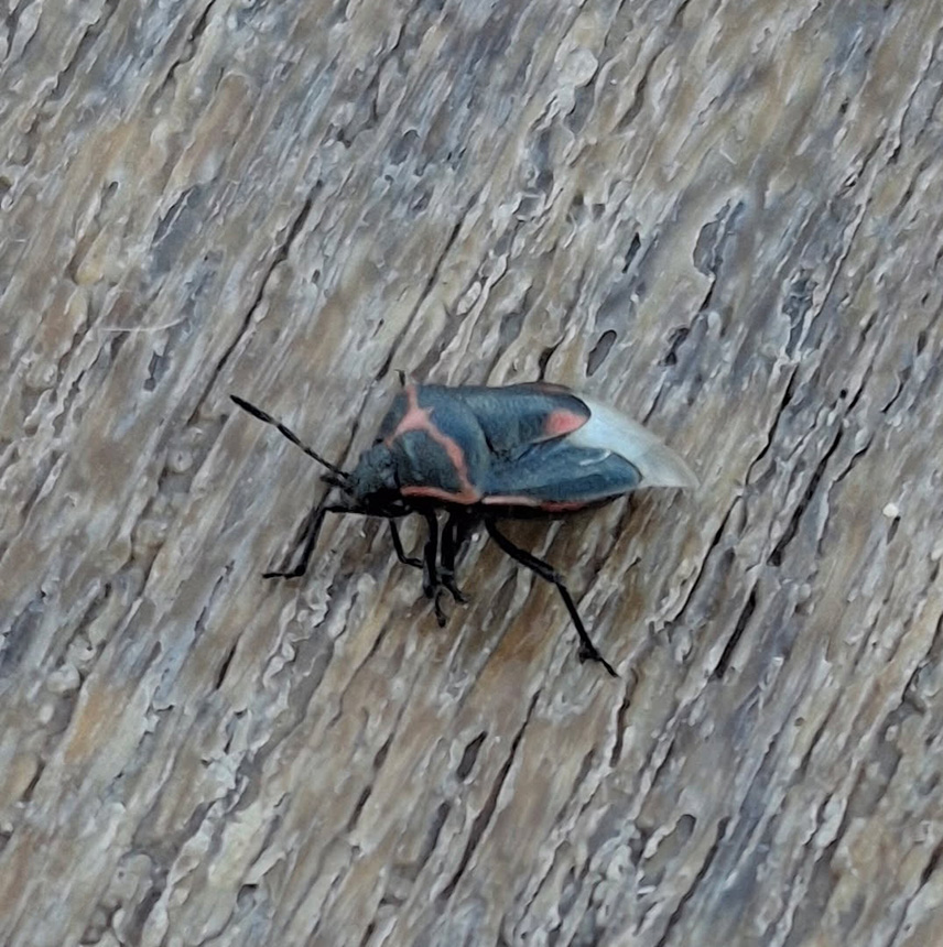 The upper plate covering the first segment of the thorax (pronotum) is black with bright red markings, including a band from side to side, a stripe on the midline, and thin borders on the sides. The plate covering the third segment of the thorax (scutellum) is large and triangular, but it is not longer than the thickened part of the forewing, and does not reach the tip of the abdomen. It is black with two distinct red spots on the margin near the end (apex). These spots are most likely the origin of this insect’s common name twice-stabbed stink bug.