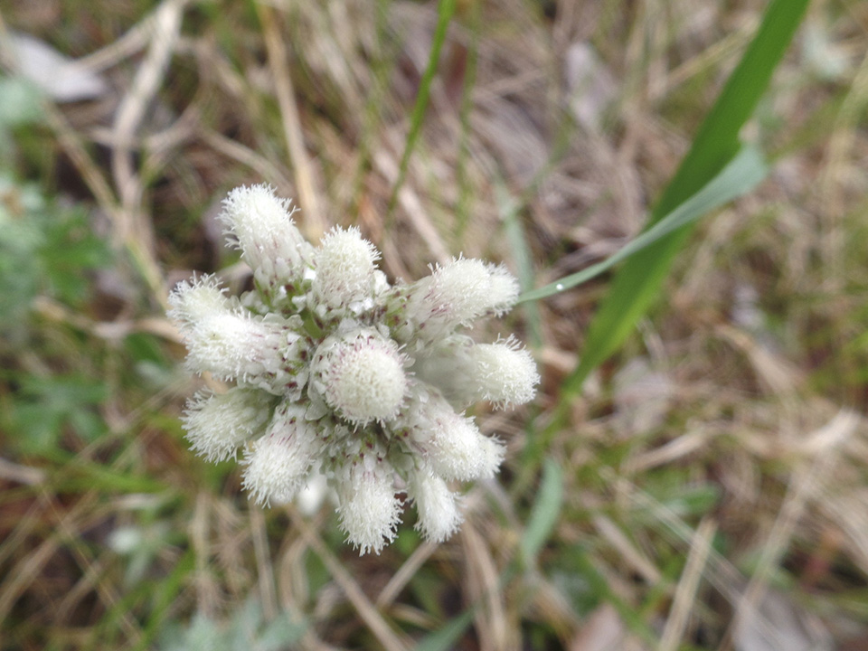 Parlin’s pussytoes (Antennaria parlinii) has a taller flowering stalk, up to 6″ tall. The basal leaves are longer and wider. They have 3 to 5 main, parallel veins that are prominent at least on the underside to the broadest part of the leaf.