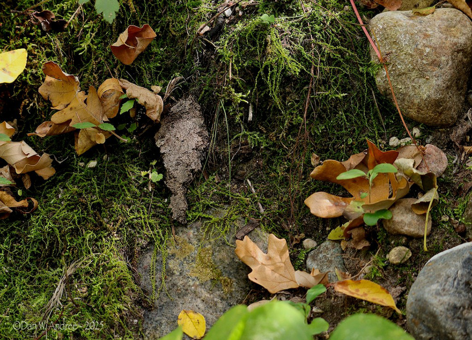 The sporophyte (the spore-producing generation) is rarely produced. When present, it consists of a smooth, cylindrical capsule elevated on a long stalk (seta). The seta is slender and ⅜″ to ⅝″ (10 to 15 mm) long. The capsule is 1⁄16″ to ⅛″ (1.6 to 2.8 mm) long. At the end of the capsule there is an obliquely angled opening. When immature, the capsule opening (mouth) is covered with a membranous hood (operculum) and a large, cap (calyptra). The operculum has a short extension (beak) at the tip. At maturity, the calyptra splits and falls away revealing a double ring of minute teeth, which regulates the release of spores. The teeth on the outer ring (exostome) are irregular and 1⁄64″ (0.3 mm) long. The basal membrane on the inner ring (endostome) is 3 or 4 cells high.