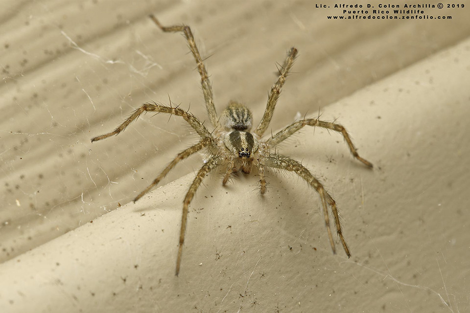 Potter’s grass spider is a medium-sized, sedentary spider. It is native to and occurs across North America from Nova Scotia to Virginia west to southern British Columbia and Colorado. It has also been introduced to the Ukraine and Kyrgyzstan. It is found in areas with grass, shrubs, rocks, or buildings. It builds its web on lawns, in taller grasses, on low shrubs, on stone fences, in corners of buildings, and in basements. The female is ⅜″ to 9⁄16″ (9 to 14 mm) in length not including the legs. The male is a little smaller, 5⁄16″ to ½″ (8 to 13 mm) in length. The hardened plate (carapace) covering the front part of the body (cephalothorax) is longer than wide. The rear portion (thoracic region) is large, about as long as wide, and broadly rounded. The front portion (head region) is small, straight-sided, and narrow, about half as wide as the thoracic region. The carapace is yellowish to light brown. A pair of broad dark bands extends from the eye region to the rear margin. There is also a thin dark line on the lateral margins. The face is vertical. The finger-like sensory mouthparts (palps) on the male are relatively very large. The jaw-like mouthparts (chelicerae) are reddish-brown, stout, and vertical. There is a fang at the end of each chelicera. The fang rests in a groove. The fang groove has three teeth on the front margin and three teeth on the hind margin. On the male, the leaf-like extension (embolus) at the tip of the genital bulb is hooked. There are eight eyes arranged in two rows of four eyes each. Both rows are strongly curved and close together, so that the anterior median eyes (AME) and the posterior lateral eyes (PLE) form almost a straight line. The eyes are slightly unequal in size. The AME are the largest and the posterior median eyes (PME) are the smallest. The abdomen is yellowish-gray to reddish-brown above, with a broad pale median stripe and a broad pale stripe on each side. The central plate on the underside (sternum) is yellow to brown and has a distinct, very dark, V-shaped mark. Like other funnel-web spiders, the spinnerets extend well beyond the end of the abdomen and are visible from above. The abdomen is usually large, broad, and thickest in the middle on the female, smaller, narrow, and thickest closer to the base on the male. It is pointed at the rear on both sexes. The legs are long, thin, and spiny. Like other grass spiders, they have dark and light bands, but on this species the bands are less distinct. The second segment (trochanter) is not notched. The last segment (tarsus) has three claws at the tip, but these may not be visible without magnification. There is no tuft of hairs (scopula pads) at the end of the tarsus. |