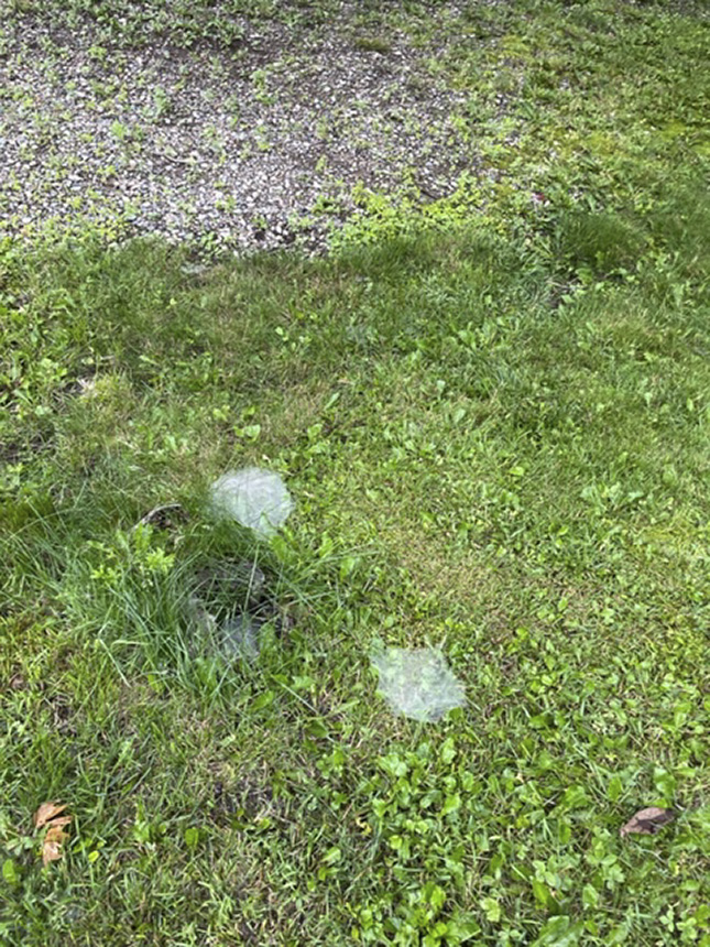The web is a flat sheet with a funnel on one side and a barrier above. The threads are not sticky. The sheet is horizontal or nearly horizontal and slightly concave. The funnel is small and serves as a retreat. It is open at the lower end allowing the spider to escape if disturbed. The barrier is three-dimensional. When a flying insect hits the barrier it drops to the sheet and its feet become entangled in the threads. The spider, which had been waiting in the retreat, rushes out, bites the insect to subdue it, and drags it back to the retreat to consume it. Webs are built on lawns, in taller grasses, on low shrubs, on stone fences, in corners of buildings, and in basements. The web starts small and thin but is expanded as the season progresses. Each time the spider passes over the web it leaves a drag line, making the sheet thicker. Webs built in grass are most noticeable in the morning when they collect dew. Webs built in protected areas of buildings may last for years. |