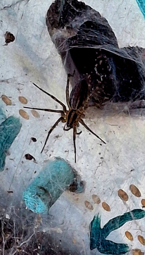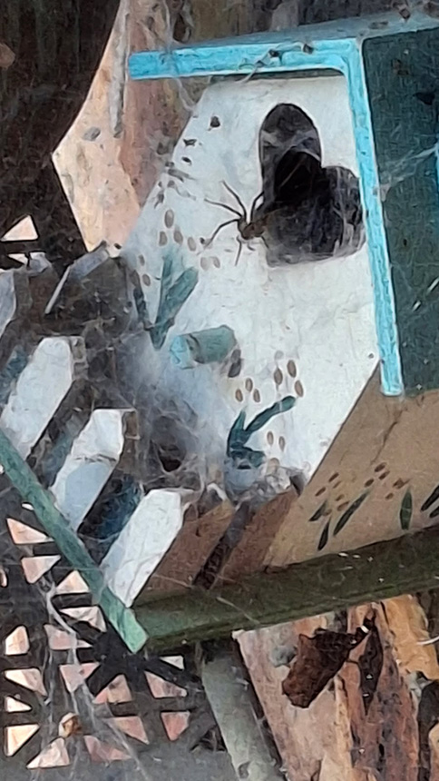 … spider living in tiny bird house near our front door. Also noted several wrapping webs around the nearby sumac leaves creating a den, somewhat of a cave. |