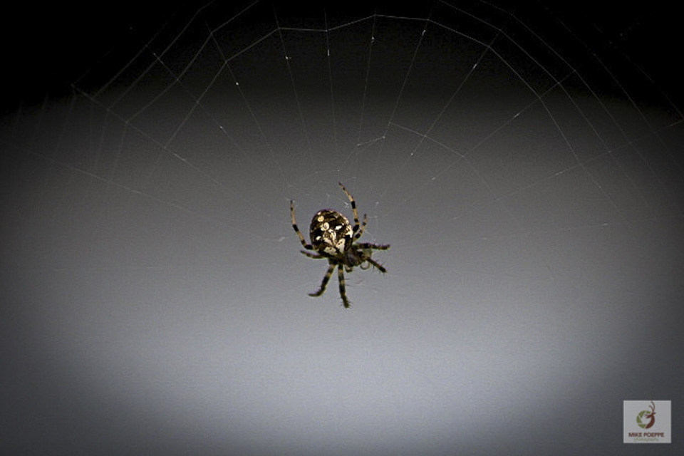 The spider spends the day in the retreat and hunts at night. When hunting, it sits in the center of the web with the tip of its abdomen pushed through an open space in the hub. |