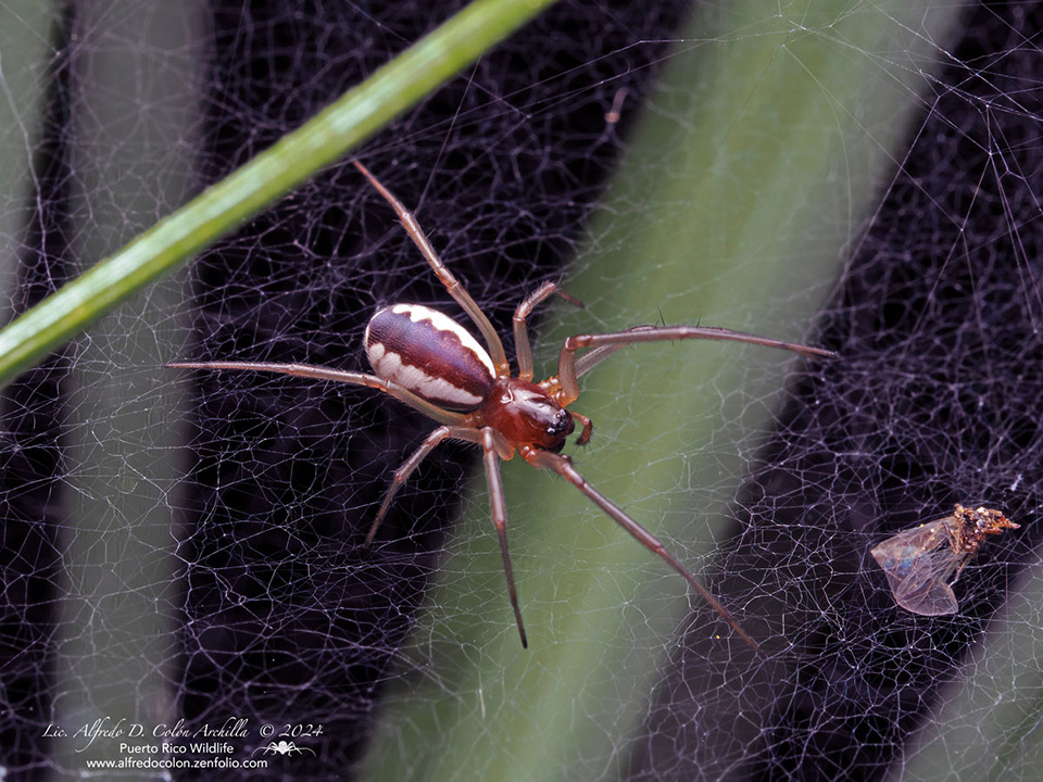 The web typically consists of a “finger-bowl-like” web suspended below a much larger, flat, almost horizontal sheet of irregular, tangled threads. This is the feature that gives the species its common name. The web is built in low branches of trees, in shrubs, and in tall grasses. The spider clings upside down under the center of the bowl. When an insect hits one of the tangled threads, it falls into the bowl. The spider then pulls it through the bottom and carries it to the sheet to consume it. |