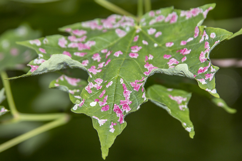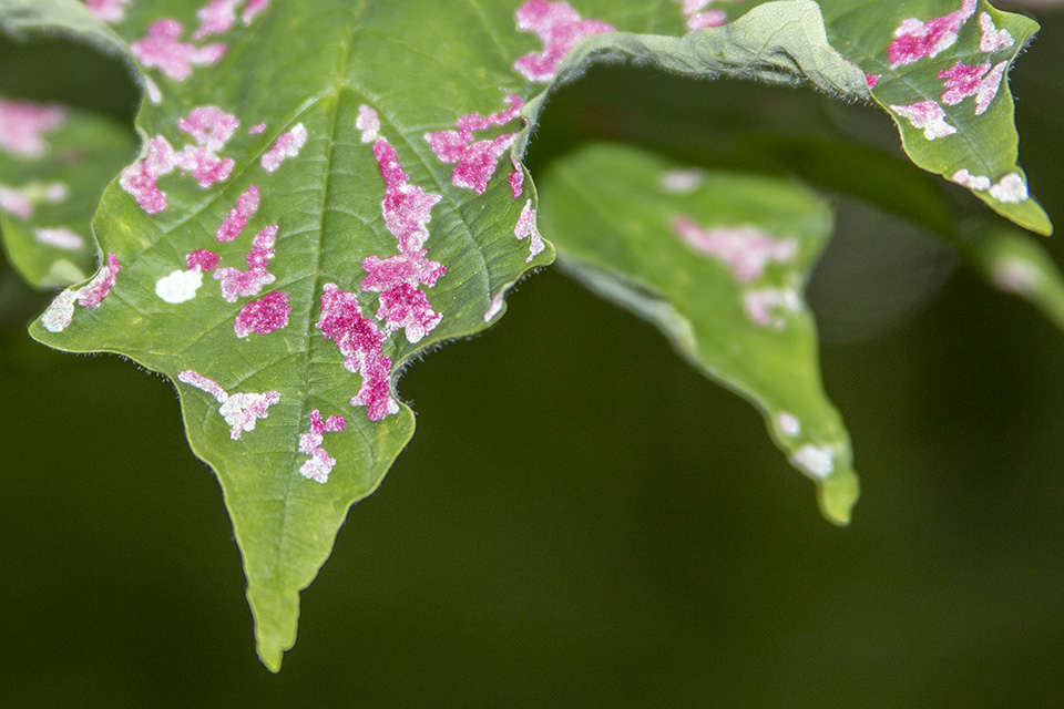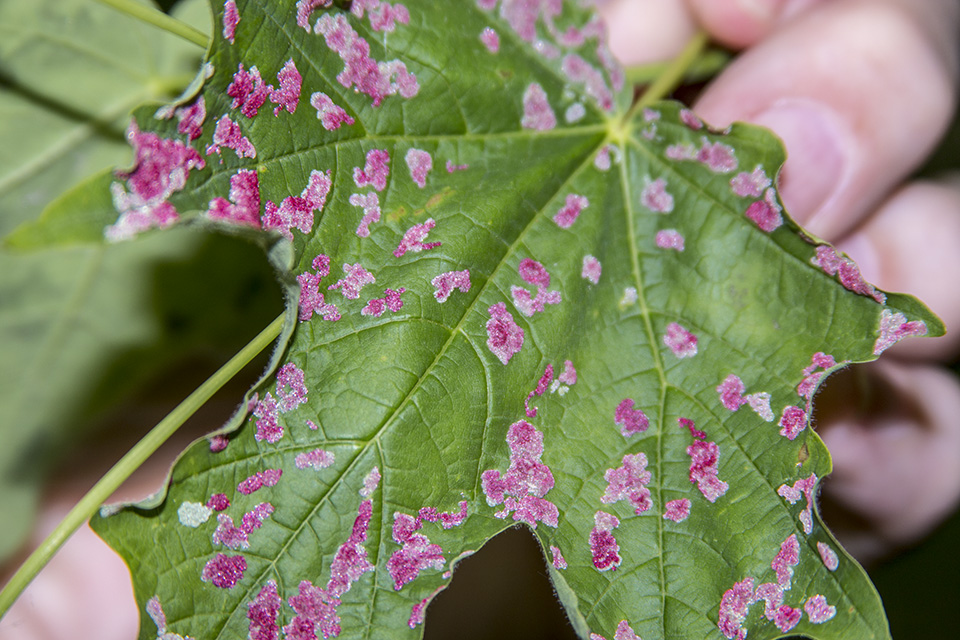 At only one tenth the width of a human hair in length, a crimson erineum mite (Aceria elongata) is barely visible to the human eye unaided by magnification. Its claws, dorsal shield markings, and other identifying body features are not. Identification in the field is possible only by noting the properties of the abnormal growths (galls) it produces on its host. When an individual leaf cell is injured by a mite, it produces a small, nipple-like projection (papilla) on the upper surface of the leaf. The papilla has a rounded tip, visible only with magnification, and is filled with colored fluid. As the mite feeds on adjacent cells, the aggregation of papillae forms a pustule-like, felty patch (erineum). The erinea are usually scattered over the leaf surface, thickest toward the upper (apical) half, and avoiding the major veins. They are greenish-white at first, soon becoming crimson or purplish. They reach their maximum extent, and are most noticeable, in summer. The infestation is sometimes abundant and can cause leaf distortion and premature leaf drop. |