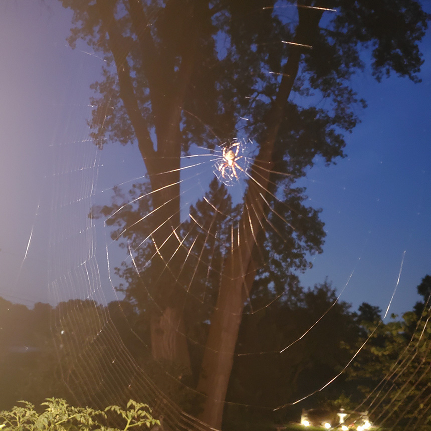 Dorsal view on web, Garage at Barnes Prairie, Racine County, Wisconsin. Photo taken August 4, 2021. |
