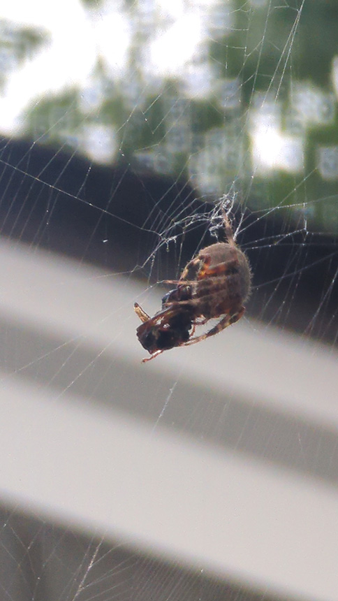 Location: Barnes Prairie, Racine County, Wisconsin Dorsal view on web, Garage at Barnes Prairie, Racine County, Wisconsin. Photo taken August 4, 2021. |