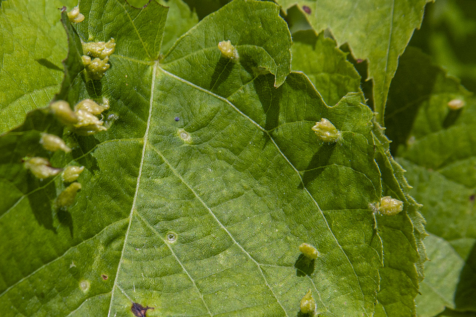 Linden wart gall midge (Contarinia verrucicola) creates round, wart-like or beebee-like galls, each one raised on both the upper and lower leaf surfaces. |