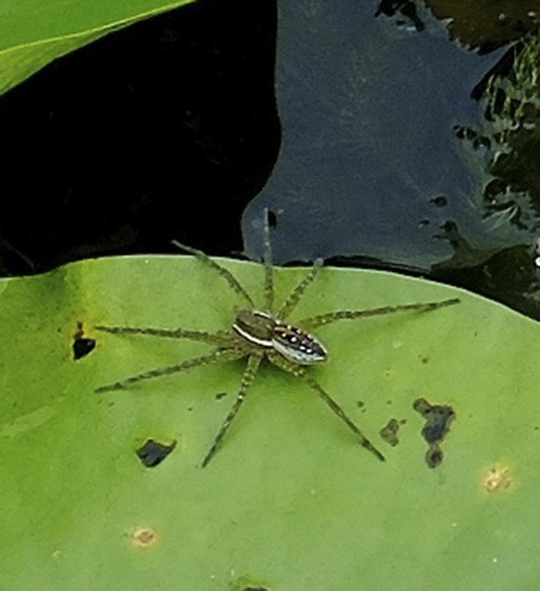 Six-spotted fishing spider does not produce a web to catch prey. The female produces a nursery web for its young. It is active during the day. It floats, and can run across the water surface like a water strider. When hunting, it perches on floating vegetation, detecting ripples and vibrations in the water with three of its front legs. It sometimes dives up to 7″ for prey or to escape a predator. It can create a bubble of air that allows it to stay under water for a half hour or more. |