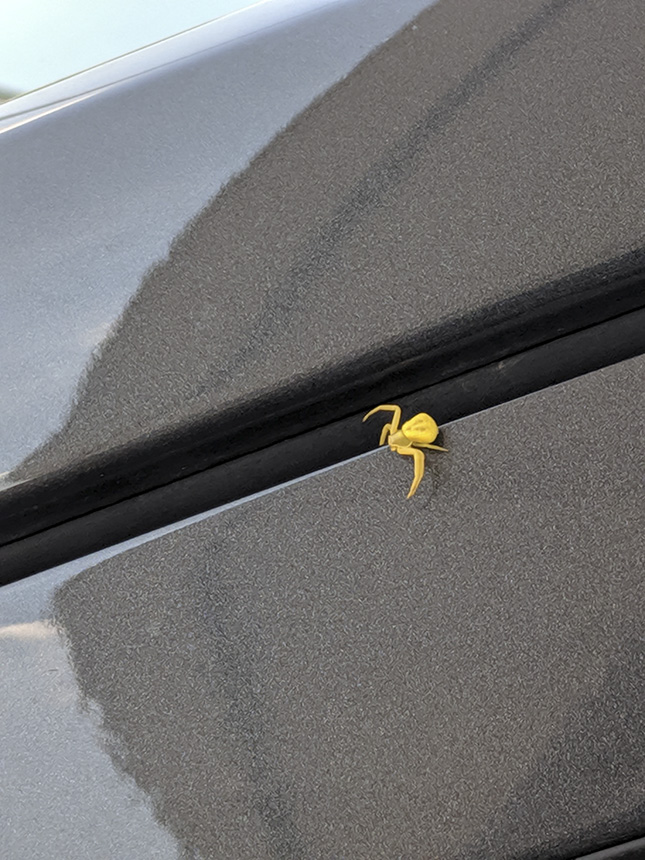 I could tell because it had a small area on one wing missing. This white spider was a little bigger than the white-banded crab spider that tried to capture the western honey bee in a past season. |
