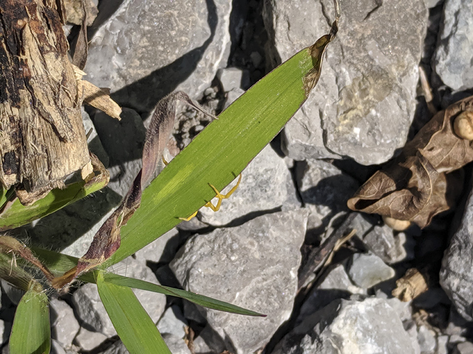 Location: Barnes Prairie, Racine County, WI Misumenoides formosipes, whitebanded crab spider, on Solidago canadensis, Canada goldenrod, leaf |