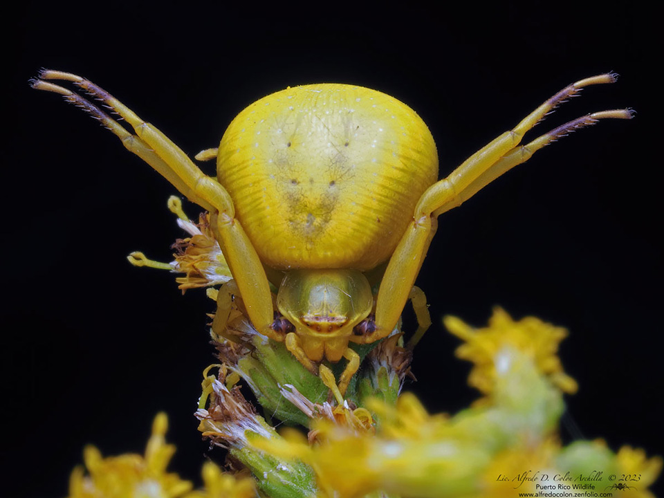 White-banded crab spider is a small to medium-sized spider. It occurs in the United States, Mexico, and Ontario Canada. It is found from late July to late September in prairies, fields, and woodlands. The female is 3⁄16″ to 7⁄16″ (5.0 to 11.3 mm) in length, not including the legs. The male is much smaller, ⅛″ (2.5 to 3.2 mm) in length. The female is able to change the color of the body and legs from white to lemon yellow or dull yellowish-brown to match the color of the flower on which it appears. There is a spotted form female and an unspotted form female. The plate (carapace) covering the front part of the body (cephalothorax) is flat and as long as wide. It is light in the middle, darker on the sides. There are eight eyes arranged in two curved rows of four. There is a conspicuous white transverse ridge (carina) below the bottom row of eyes, and another usually white carina between the two rows. All of the eyes are on low raised projections (tubercles). In the front row all four eyes are about the same size. In the back row the posterior lateral eyes (PLE) are directed sideways and backwards at the ends of the carina. They are not visible when the spider is viewed from the front and a little above. The area between the eyes, not including the carina, is sometimes reddish. On spotted form females there is sometimes a reddish stripe on each side of the carapace extending from the PLE almost to the rear margin. The jaws (chelicerae) are small and have no teeth. The abdomen is large, broadly oval, widest near the rear, and somewhat flattened when viewed from the side. There are no erect hairs (setae) on the upper surface. Spotted females have two rows of reddish-brown spots in the shape of an inverted V on the front half. They sometimes also have a stripe on the sides of the front half. Unspotted females lack the dark markings but are often slightly darker in these areas. The legs match the carapace in color. The front two pairs of legs are thicker and much longer than the others, and are normally held out and forward, like a crab. This is the feature that gives the family Thomisidae its common name. There is a pair of minute claws at the end of each leg, but these are not visible without magnification. Males are darker overall and shiny. The front two pairs of legs are red, brown, or black. The rear legs are the same color as the carapace. |