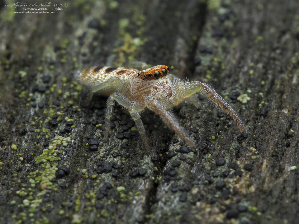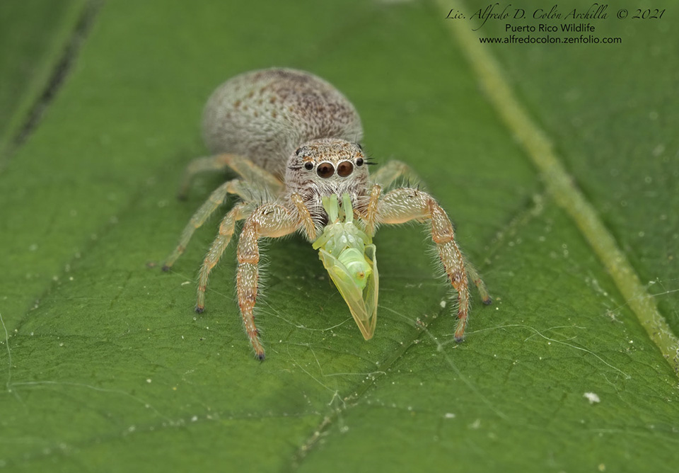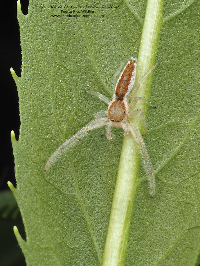 White-jawed jumping spider is a common, small, typical jumping spider. It occurs in the United States and southern Canada east of the Great Plains. It is common in wooded areas of Minnesota. Adults are found from late spring through summer on vegetation in woodlands and near woodlands. It is most common in the canopy of deciduous and coniferous trees. The female is ⅛″ to 3⁄16″ (2.9 to 4.5 mm) in length and has a ¼″ (6 to 7 mm) legspan. The male is smaller, ⅛″ (3.5 to 4.1 mm) in length. The body is slightly elongated. On the female, the front part of the body (cephalothorax) is longer than wide and somewhat flattened. The plate covering the cephalothorax (carapace) is orangish-brown. It is covered with white hairs and irregularly covered with white scales giving it a mottled appearance. There are four pairs of eyes arranged in what appear to be three rows occupying less than half of the carapace. The first row of four eyes, consisting of the anterior median eyes (AME) and anterior lateral eyes (ALE), is curved backward. The AME are the middle and forward-most pair of these. They are by far the largest of all of the eyes and can be moved. The AME are about twice as large as the ALE. The second row of two eyes are the posterior median eyes (PME). They are very small and are barely or not at all noticeable in most photos. Below each PME there is a pair of close tufts of long black hairs (hair pencils). The third row of eyes is the posterior lateral eyes (PLE). The PLE are set far back on the head and are only slightly wider apart than the first row of four eyes (AME and ALE together). The PME and ALE form a wide rectangle. All of the eyes are ringed with light brown. The narrow plate above the mouth (clypeus) is covered with white hairs. The prominent mouthparts (chelicerae) corresponding to jaws are whitish. There are two sensory appendages (palps) associated with the mouthparts. The palps are yellowish. The chelicerae and palps are covered with long white hairs. The abdomen is grayish-white due to a covering of long white hairs intermixed with short black hairs. In the middle there are two rows of paired dark spots. On the first pair the spots are small and distinctly separated. On the second pair and third pair, the two spots usually merge together, making single large spots. The spots are often indistinct. The legs are translucent and unpigmented. The first pair of legs are the longest. The femur and patella have spatula-shaped hairs on the lower margin. On the male the carapace is orangish-brown with a reddish-brown band on each side that extends around the eyes. In the center it is covered with white hairs and irregularly covered with white scales giving it a mottled appearance. The abdomen is narrower, orangish-brown on top, and grayish white on the sides. |
