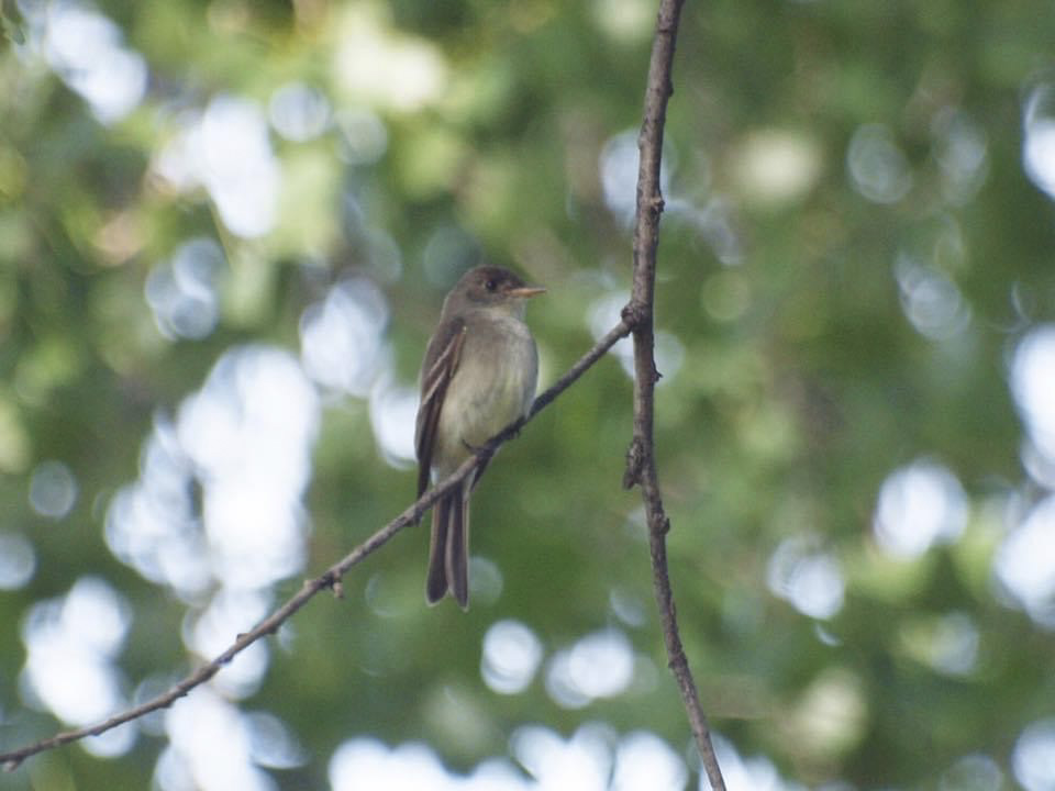 A Eastern Wood-Peewee along the walking trail from The Big Stone National Wildlife Refuge in Lac qui Parle County that heads into Ortonville, Mn. This little bird landed on the dried twigs sticking out of the bush for about a minute or two, which surprised me as they often land and take off again. |