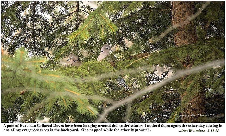 Location: Green Isle, MN (Sibley County) A pair of Eurasian Collared Dove's are nesting nearby and visiting the area under our bird feeders |
