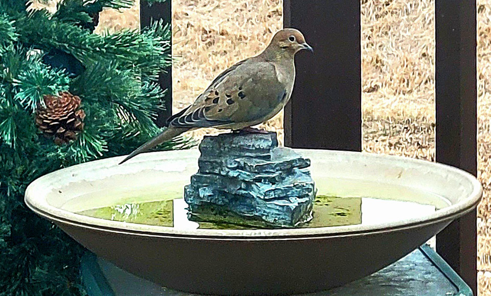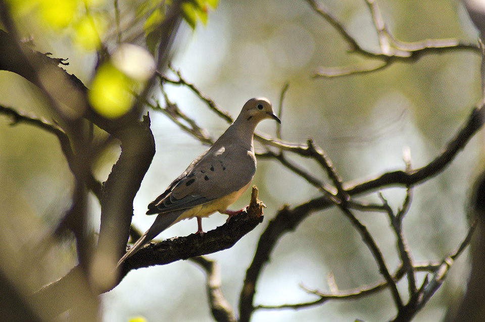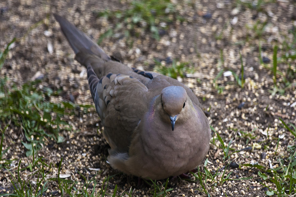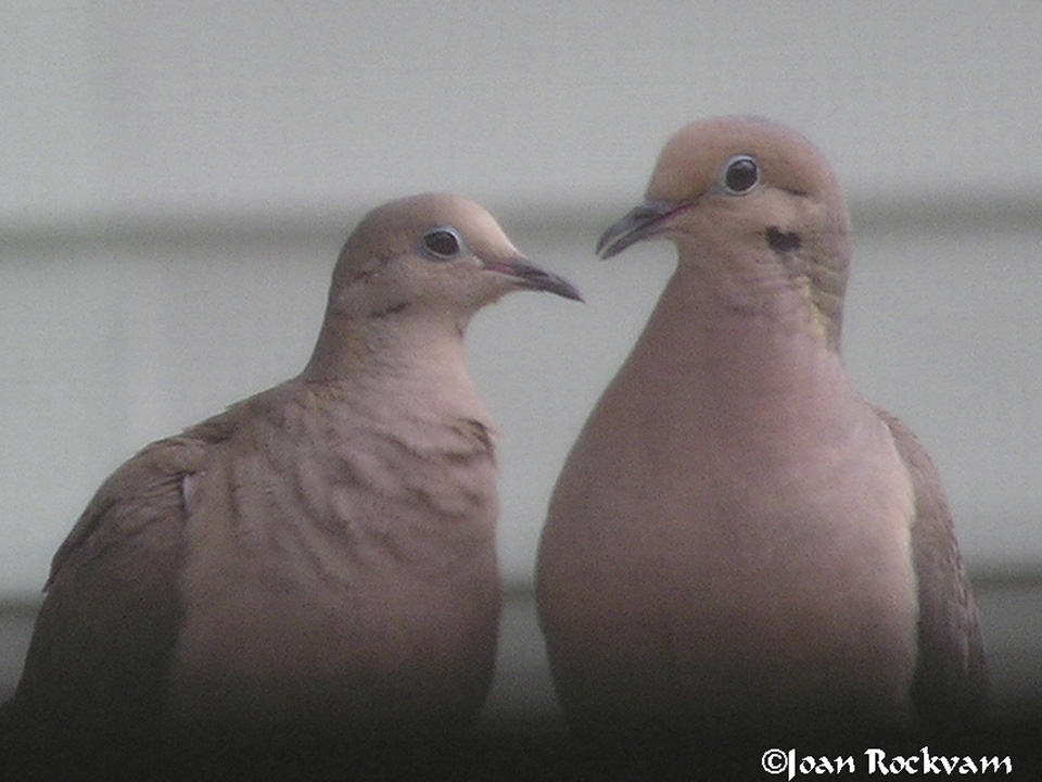Mourning Dove is a medium sized, 9″ to 13″ long, slender bird with a wingspan of 15″ to 18″. It weighs 3 to 6 ounces. The adult male head, neck, breast, and belly are mostly light brown. The top of the head and nape of the neck are bluish gray. The face, throat, and breast have a pinkish tint. The neck feathers have a pink iridescence. The back and upper wings are grayish brown. The rump is not white. The wings have large black spots. The tail is dark brown or gray, long, and tapered, the inner feathers longer than the outer ones. The 3 outermost tail feathers have white tips bordered by black. The head is small and rounded. There is a small black spot just below and a little behind the eye. The eyes are dark and are surrounded by blue skin. The beak is short, thin, and dark. The legs are short and reddish. The feet are reddish with 3 toes forward and one toe back. The female is similar to the male but less colorful. The top of the head and nape of the neck are olive gray. The face and throat are olive brown. The breast is tan. The neck feathers have an olive green, sometimes with pink, iridescence. The 1 or 2 outermost tail feathers have white tips bordered by black. On taking flight the wings produce a light, airy whistle and clap at the top and bottom of the stroke. |