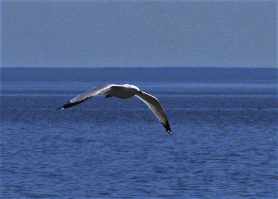 A Ring-billed gull in flight as it executes a turn in the air. |