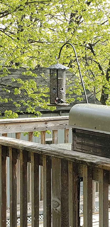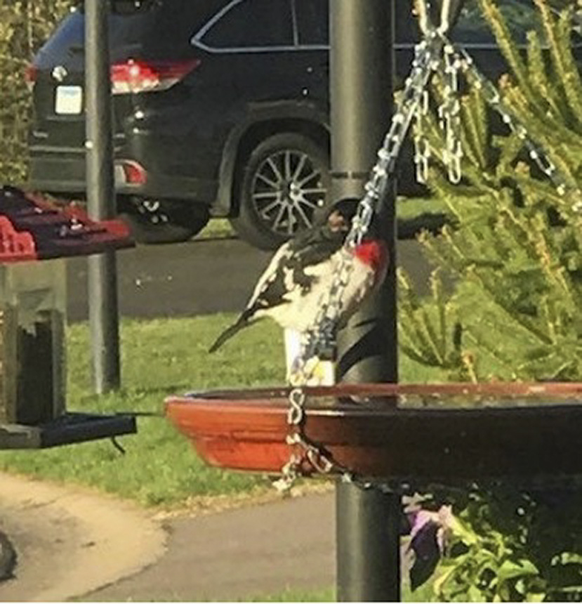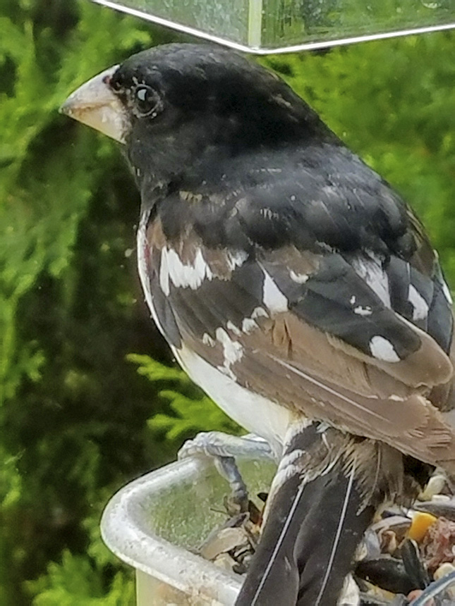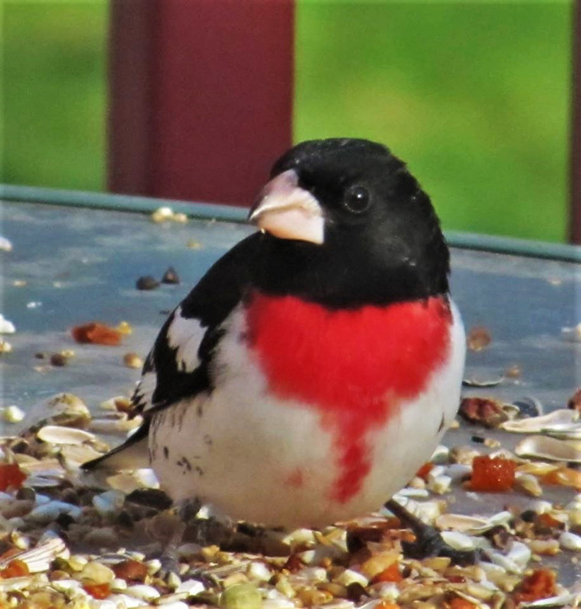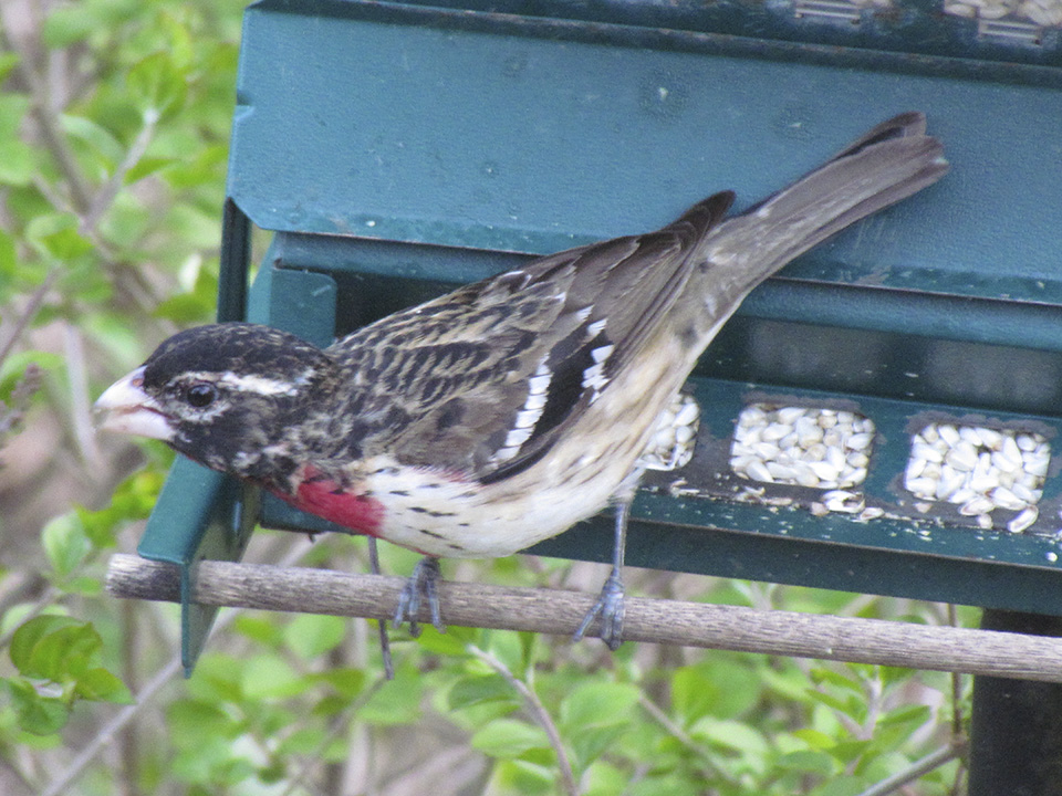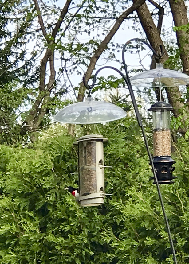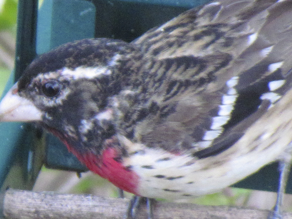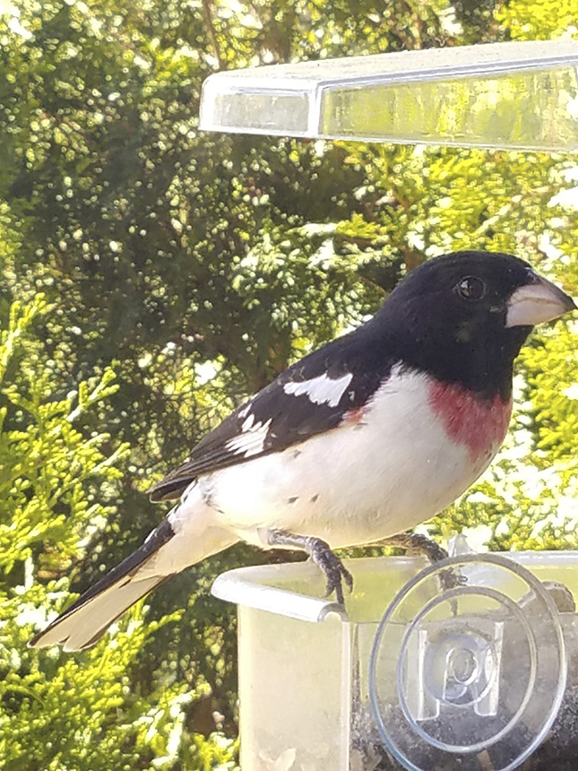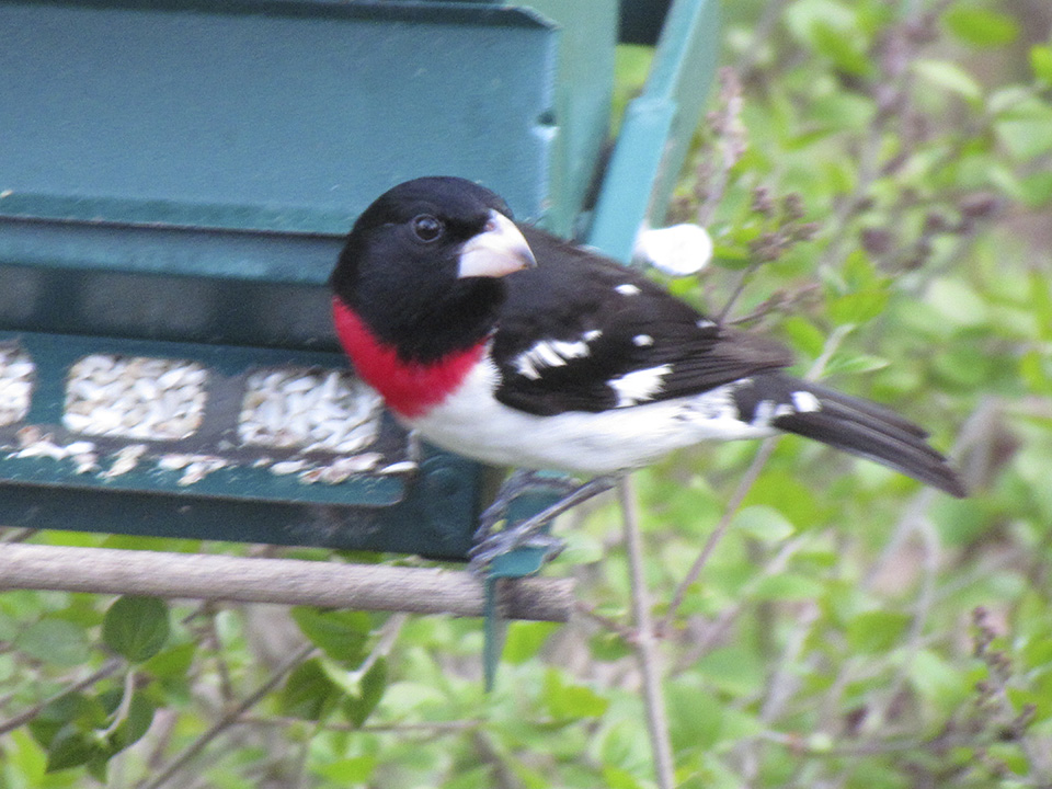 Location: Maplewood, MN. We just had our first sighting of a male rose-breasted grosbeak at our sunflower seed feeder. |
