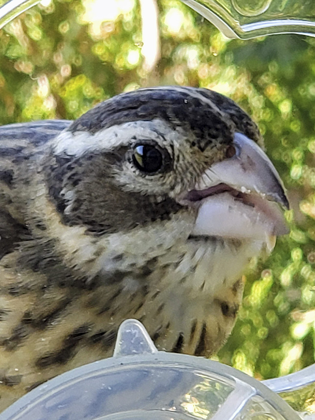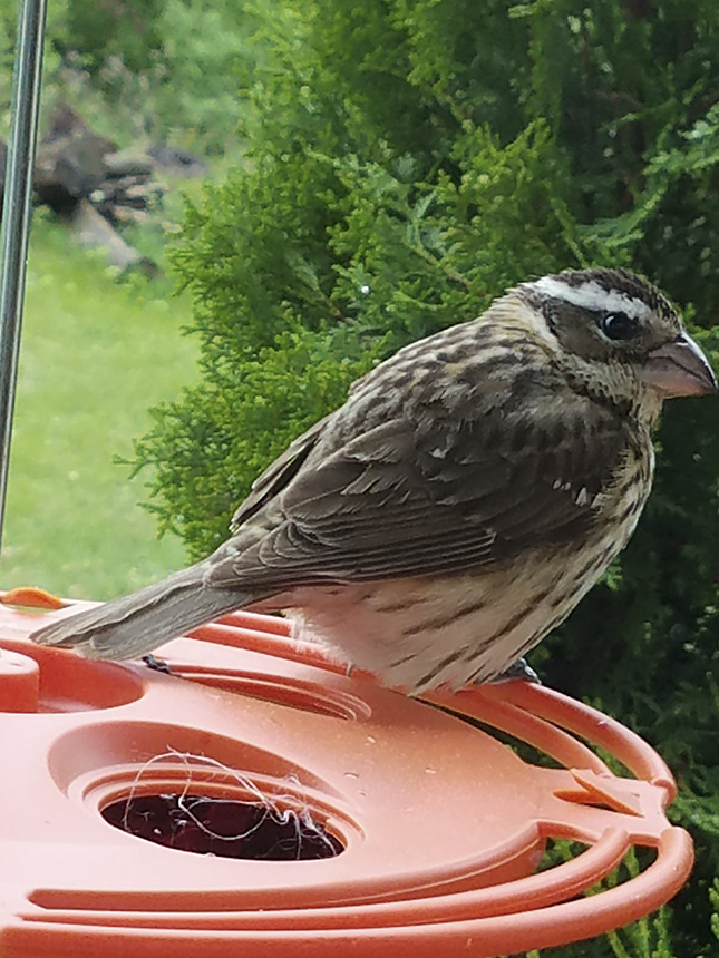 Location: Blaine Mn. beautiful rose breasted grosbeak at our black sunflower seed feeder this morning 7-19-22. Did not mind sharing feeder with busy chickadees! |