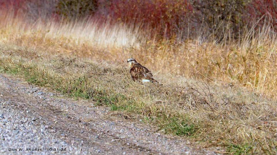 Rough-legged Hawk... It was sitting along a gravel road near some grasslands waiting to pounce on either a mouse or gopher it must have seen near a hole. |