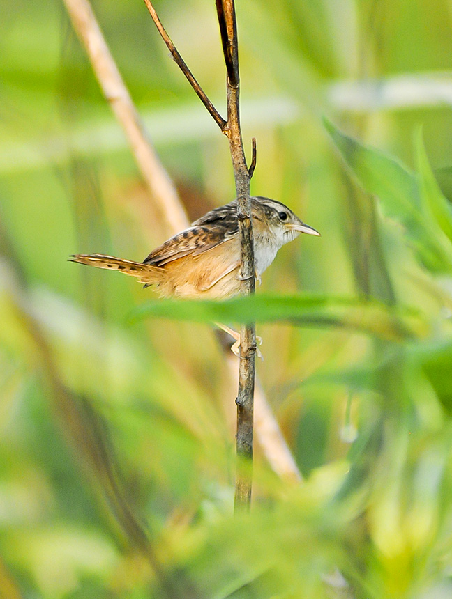 Published on Jul 16, 2013 This wren is uncommon and local. It can be found in central and eastern North America. in grassy marshes, sedges, grassy meadows. It has a faint eyebrow stripe, a streaked crown and back. It is a tiny secretive bird which is more often heard than seen. It's song is a dry chattering "chop chop chop chop chop chopper-rrrrrr". |