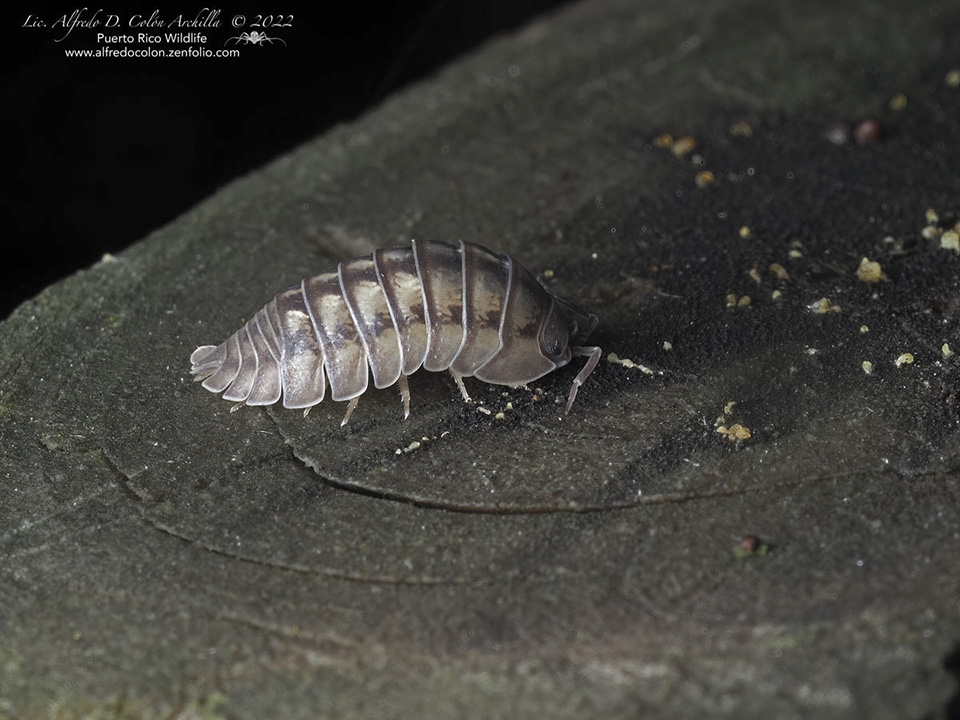 Nosy pill woodlouse, also called nosy pillbug, is a large, exotic, terrestrial woodlouse. It is native to southwestern Europe. The precise date of its introduction into North America is unknown, but it was collected in a town in southern Iowa by M. Longnecker in 1924. It now occurs in the United States from Maine to South Carolina, west to Minnesota and Oklahoma, with additional scattered populations in major metropolitan areas in the rest of the country. In southern Canada it occurs in Nova Scotia, Quebec, Ontario, and British Columbia. It is said to be one of the most common of all onoscids (suborder Oniscidea) in southeastern United States. Nosy pill woodlouse is found in cities, old quarries, graveyards, agricultural areas, railway lines, houses, garden centers, and greenhouses. It is usually found under logs, stones, or other structures that create a shady, humid microhabitat. It is synanthropic, meaning that it has adapted to live in close association with humans. Most observations in natural areas are in forests near roads or buildings, indicating that the species was transported through human activity, such as the dumping of stones. It is rarely found in grasslands, except where there is a heap of stones nearby. Adults are ¼″to 13⁄16″ (6 to 21 mm) in length. The body is oval in outline and more or less compressed above. There are three color variations: dark gray, red, and brown. There is a pair of dark longitudinal stripes in the middle (middorsal stripes) and one dark longitudinal stripe on each side (lateral stripes). The head is about twice as wide as long. A narrow, squarish lobe (snout) protrudes in front of the head like the bill of a ball cap. This is the feature that gives the species its common name. There are two small compound eyes, one on each side of the head, and no simple eyes. There are two pairs of antennae. The first pair are greatly reduced to the point of being almost microscopic. The thorax (pereon) is large and has seven segments of slightly unequal length. There is a single jointed leg on each side of each segment. The upper exoskeletal plate (tergite) on each thoracic segment and the first five abdominal segments are expanded on each side into a thin, flat, lateral extension (epimeron). On tergite 1, the rear angle of the epimeron extends sharply backward. On succeeding tergites, the angle is progressively less. On the tergite 1, the front angle on each side extends forward. The abdomen (pleon) is much smaller and has six segments, all of which are distinct. The junction between the pereon and the pleon is smooth, not stepped. The lateral portions of the first two abdominal segments are concealed beneath the seventh thoracic segment. The third, fourth, and fifth segments have prominent, well developed, epimera. The last segment, the sixth, is called the telson. It is rounded and does not extend beyond the epimera of the fifth segment. On each side of the telson there is an elongated appendage, called a uropod. The uropods do not extend beyond the end of the body. |