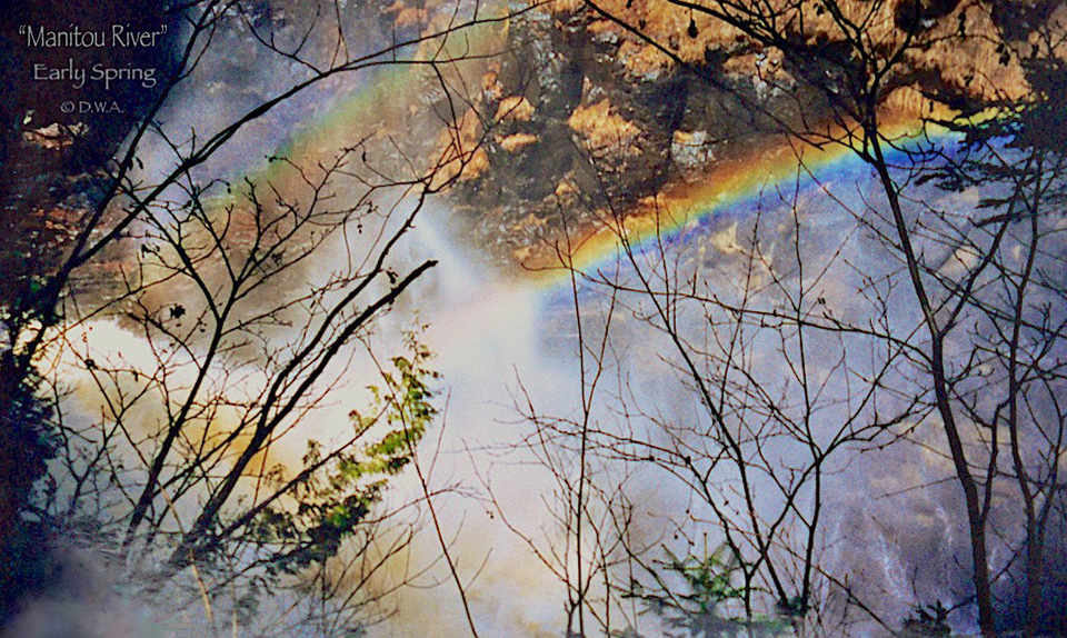 Early Spring Manitou River Falls... This was from one April along the Manitou River. The river was the highest level I had seen and a mist bow and at times a double mist bow appeared from all the spray along with the sun coming out at times. There is quite a story that goes with this visit that early Spring, but it could be a bit too long to tell. |