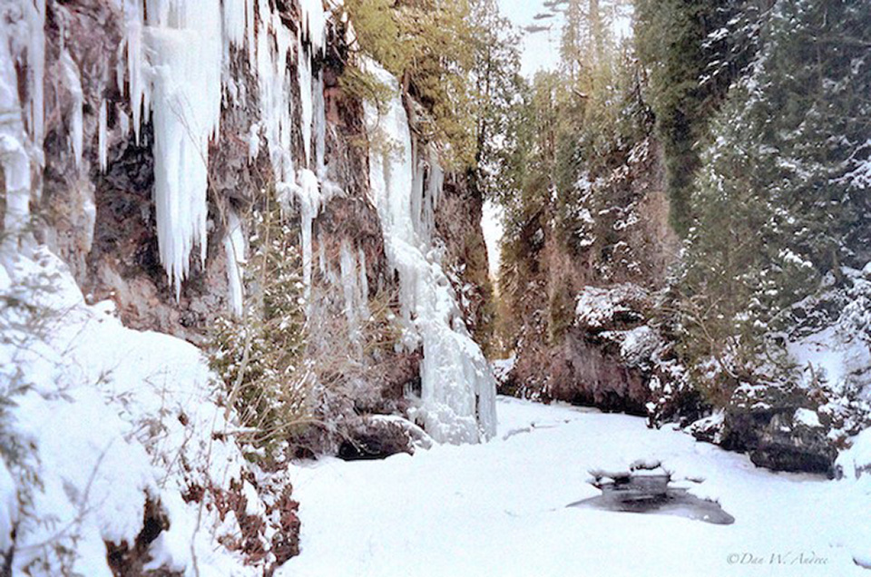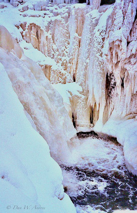 Manitou Falls February... Some ice formations around the falls. The river was frozen over most areas but part of the falls was flowing. The very top part was still ice and snow covered. In the gorge there were other ice formations in areas. Some with different color tints to the ice but I didn’t get any good photos at least that I can find. This was also from late Feb. 2002. This is pretty interesting and one can see some natural tannin staining in the ice formation coloration. |