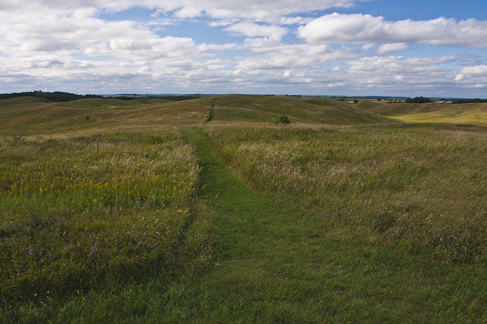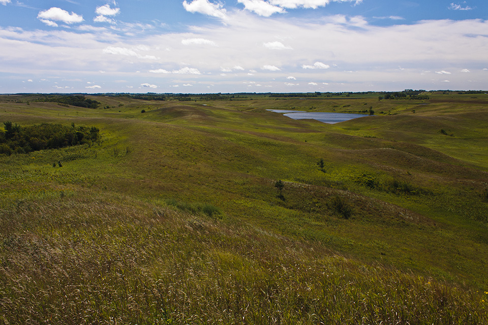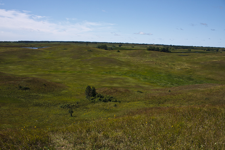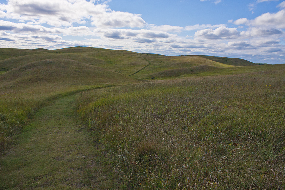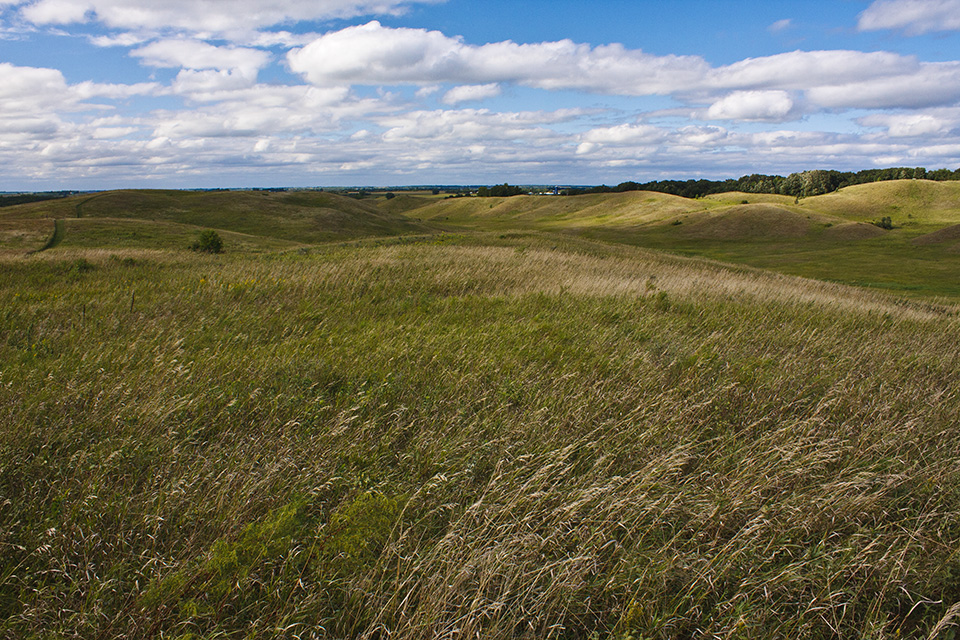 Several state parks in western Minnesota preserve parts of the state’s once vast tallgrass prairie. The best of these by far is Glacial Lakes State Park. It is located in the Leaf Hills, a 10 to 19 mile wide region of glacial hills stretching from Detroit Lakes to Willmar. Hiking trails on treeless, wide open prairie lead over rolling hills, eskers, kettles, and moraines. One section of the prairie loop trail follows ridge line with spectacular views of the prairie below. Another trail leads through bur oak forest. In all, there are 16 miles of natural surface hiking trails. If you visit, come early and plan to spend the whole day. |