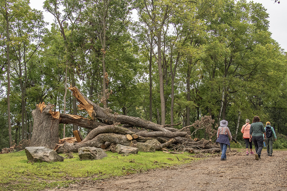The massive bur oak on top of Magelssen Bluff, Rushford, MN was toppled over by the storm on July 29, 2025. This is all that |