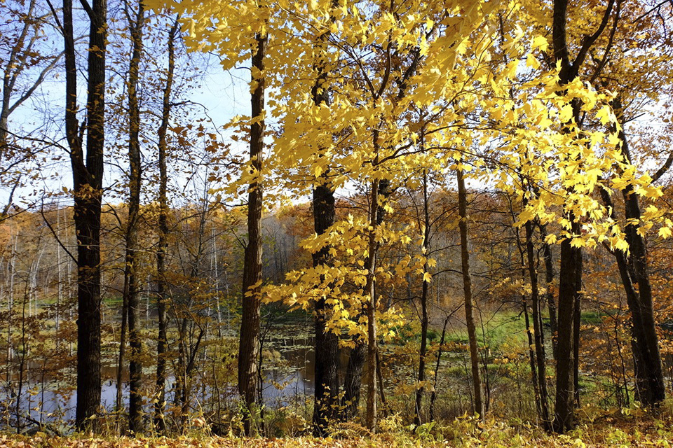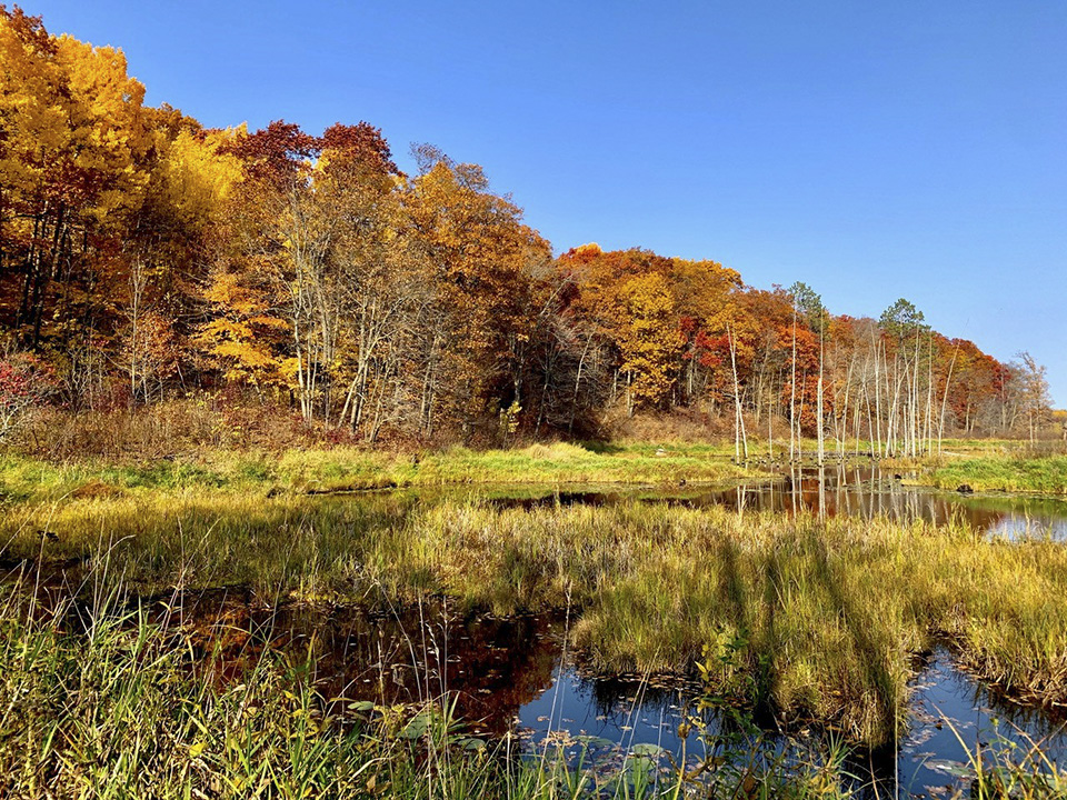 Steep hills punctuated by small lakes and wetlands characterize the landscape known as the Mille Lacs Moraine. |