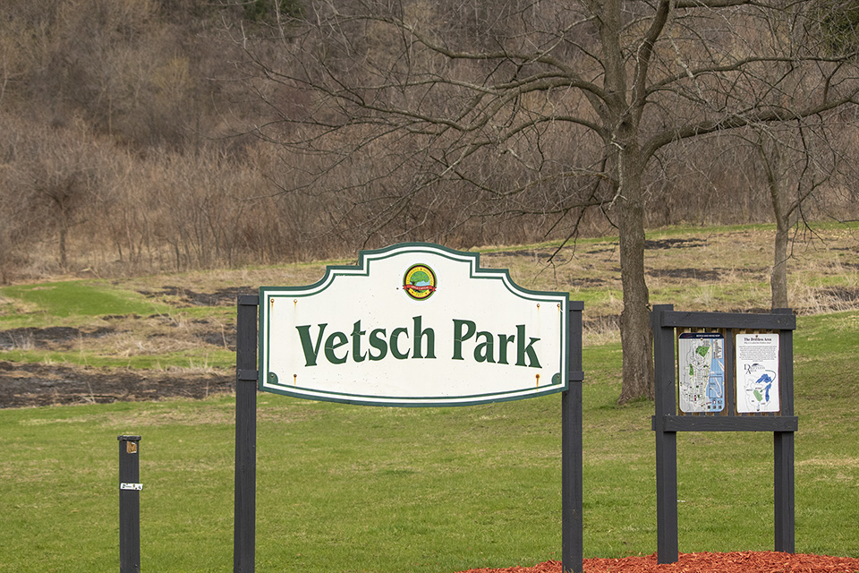 Vetsch Park is the second largest park in La Crescent Minnesota. There is a parking area at the end of N. 2nd St. A short mowed trail leads west from the parking area, past a dog walking area, to a 0.52-mile loop trail. The loop trail passes through a red oak - white oak - silver maple forest as it climbs a steep bluff, follows a ridge line, and returns to the parking area. There are also several other intersecting trails within and south of the park. One of these trails leads to Stoney Point, a bald area with a spectacular view of La Crescent and the Mississippi River. The narrow ridge and steep bluff is characteristic of the topography of the driftless area in southeastern Minnesota and western Wisconsin. |