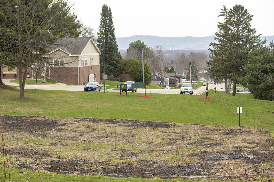 The view from near Stoney Point in Vetsch Park towards Eagles Bluff Park. The “bald spot” is the La Crescent Lookout on Eagles Bluff. |