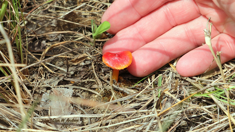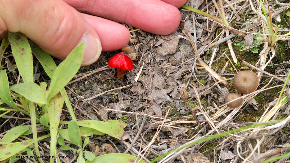 Candy Apple Waxy Cap... I seen this tiny red almost upside down heart shaped candy apple waxy cap mushroom it was one of the last few I seen this season. There is also two brown or tannish dried out small mushrooms that are seen toward the right side of the photo. I didn't see those when they were fresh, but thought it was interesting how they maintained shape etc. |