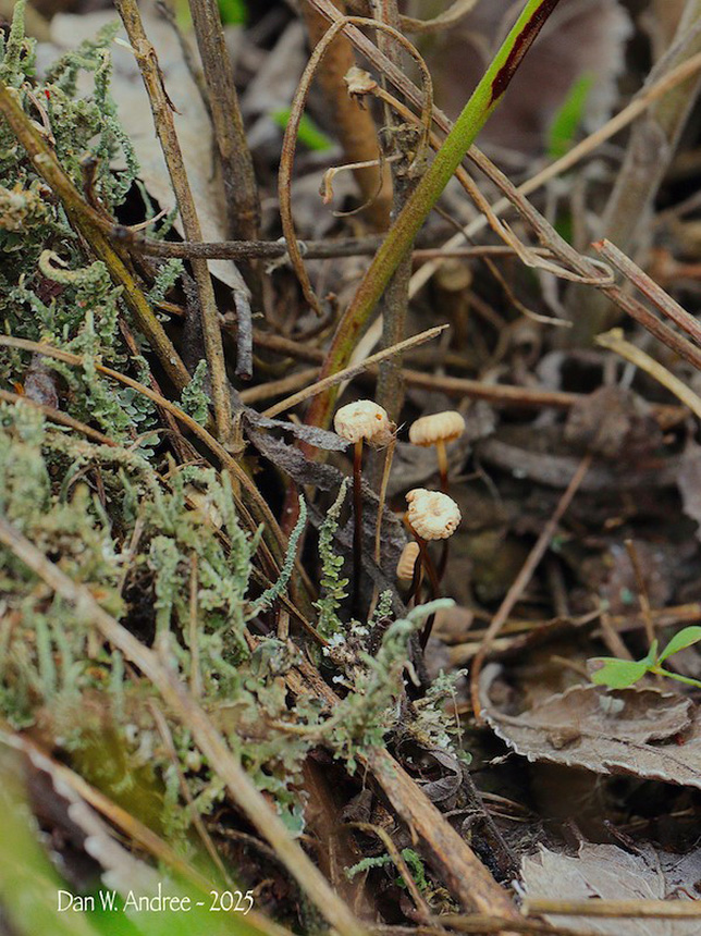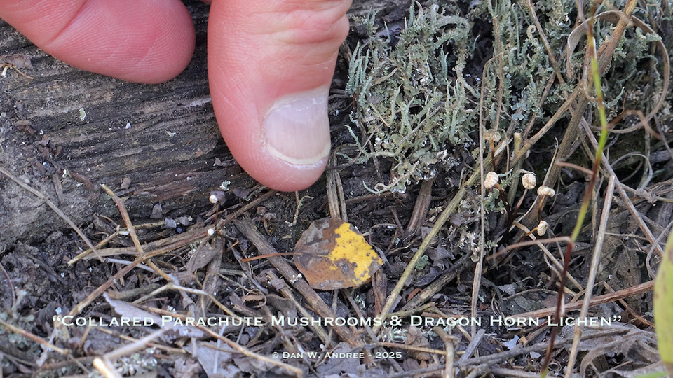 Collard Parachute Mushrooms and Dragon Horn Lichen... I went back out … and noticed two very tiny collared mushrooms you can see just below and off to the left of my thumb in the photo as well as some bigger ones to the right in the photo. One article I read on collared parachute mushrooms is after a rain they can perk right back up and I guess lichens benefit too from rain. Rain is expected over the next 2-3 days. If I get back out near that area I’ll check and see if there is a change. Been warm and dry in this area recently. |