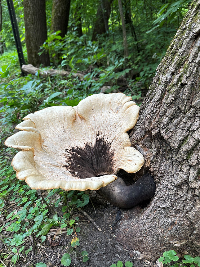 Location: Theodore Wirth Park, Minneapolis, MN Huge white Dryad’s Saddles 40 cm+ growing on old downed elm tree |