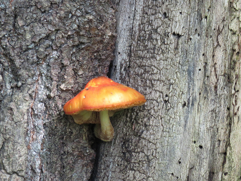 Flame Shield is a beautiful but rare wood-rotting gill mushroom. It occurs in Europe, Japan, South Korea, North America, and Mexico. In North America its range is restricted to the northeast and upper Midwest. It is rare wherever it occurs, including in Minnesota. It is found alone or in small groups on long dead stumps and well-rotted logs and branches of deciduous trees, especially elm but also ash and possibly other hardwoods. It gets its nutrients from decaying wood (saprobic). The cap is ¾″ to 23 ⁄16″ (20 to 55 mm) in diameter. It is convex and bright orange to orangish-red at first. As it ages fades to orangish-yellow, flattens out and becomes depressed in the middle. Older caps sometimes have a raised bump in the middle (umbonate). The upper surface may be dry or moist, and smooth to the touch or slightly granular, especially near the center. The margin is straight and unlined or only faintly lined (striate). The stalk is 13 ⁄16″ to 2⅜″ (3 to 6 cm) long and 3 ⁄16″ to ⅜″ (5 to 10 mm) thick. It is whitish to yellowish near the top, flushed with the same color as the cap near the bottom, and covered with ling fibers. The vegetative part of the mushroom (mycelium) is visible at the base of the stalk. The basal mycelium is white or yellowish and woolly. The gills are broad, closely spaced to nearly crowded, and not attached to the stalk (free). They are whitish at first, often yellowish near the margin, turning pinkish with age. Between the primary gills there are short, secondary gills originating at the margin. The flesh is white or pale yellow and firm. It does not change color when cut. It is edible but the taste is “not distinctive”. It may contain Psilocybin, a hallucinogenic substance. For this reason, and due to the mushroom’s rarity, collecting is not advised. The spore print is pink. |