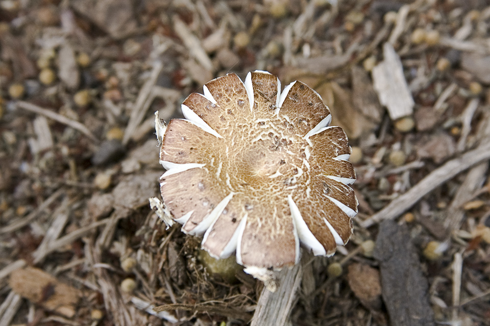 An egg-like structure that envelopes all or most of a developing gill mushroom. Remnants of the universal veil sometimes visible on a mature mushroom are patchy warts on the cap, a ring on the stalk, and a volva at the base of the stalk.