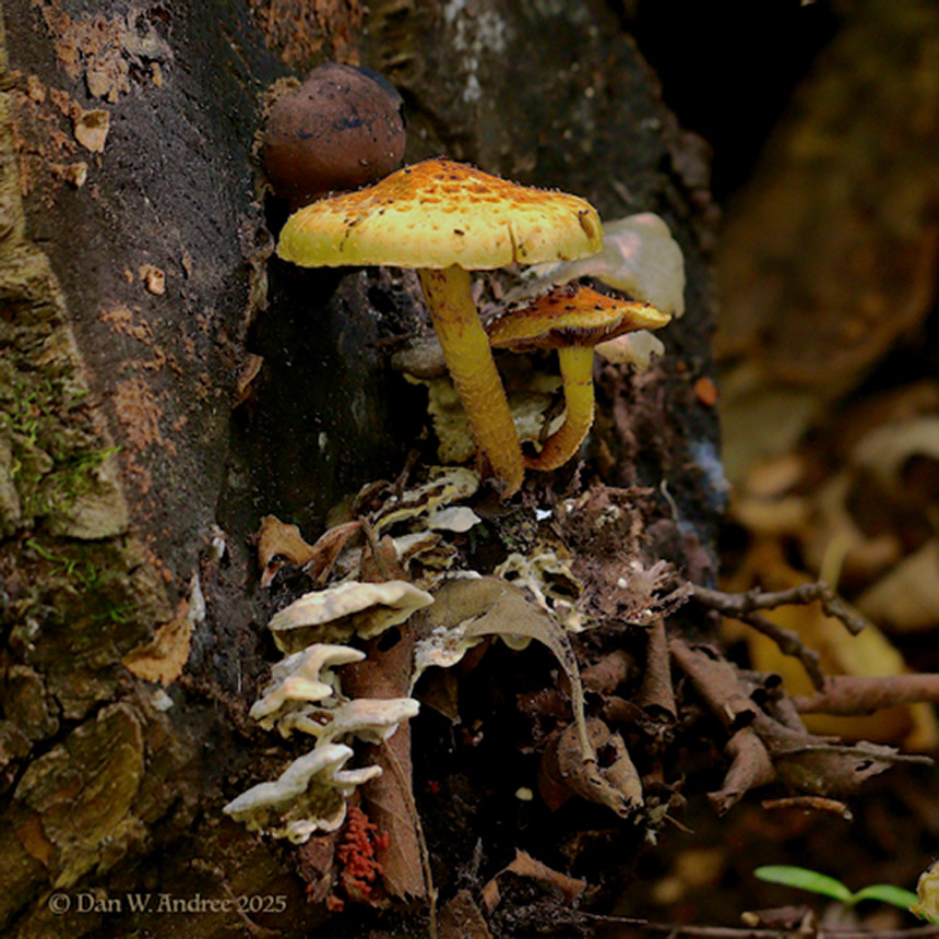 Golden Pholiota is a common, medium-sized, gilled mushroom. It is often treated as a species complex or group of several similar mushrooms, including Pholiota aurivella, Pholiota limonella, Pholiota abietis, Pholiota connata, Pholiota squarroso-adiposa, Pholiota subvelutipes, and sometimes Pholiota adiposa. Some of these species grow only on conifers, one grows only on hardwoods, and one occurs only in Europe. In field guides and online sources, they are usually all treated as a single species, growing on both conifers and hardwoods, occurring worldwide, and going under the name Pholiota aurivella, Pholiota limonella, or Pholiota glutinosa. The description that follows is of the group. Golden Pholiota occurs in Europe, Asia, eastern Australia, New Zealand, and North America. In the United States it occurs in the east from Maine to northern Georgia, west to Minnesota and Missouri, in the west from western Washington to central California, and in the mountains of Colorado and New Mexico. Outside of these areas it is mostly absent. It is found from mid-summer to late fall usually in clusters. occasionally alone. It grows on living and dead wood of both hardwoods and conifers. It obtains its nutrients from dead wood (saprobic) and probably also from living wood (parasitic). When it first appears, the cap is broadly bell-shaped or convex, yellow, yellowish-brown, or orangish-yellow. The upper surface is covered with large, brownish to reddish-brown scales. The scales are flat but often curl up at the edges. The surface below the scales is slimy when wet, sticky when moist, and smooth when dry. There are often shreds of tissue, remnants of the partial veil, hanging from the margins. As it ages the cap spreads out and the scales wash away or gelatinize and become indistinct. The mature cap is 1½″ to 6″ (4 to 15 cm) in diameter, is broadly convex or flat, and has a raised bump in the middle (umbonate). The gills are closely spaced and are broadly attached to the stalk or notched at the point of attachment. They are whitish to yellow at first, becoming brown to rusty brown or brownish-orange as the spores mature. The stalk is 1½″ to 6″ (4 to 15 cm) long, ⅛″ to 1″ (4 to 25 mm) thick, dry, and whitish, yellowish, or colored like the cap. There is a ring of tissue near the top, remnants of the partial veil. Above the ring it is smooth, below the ring it is sparsely to densely covered with scales. The flesh is yellowish or whitish. Some field guides say that it is edible, but one or more of the species in this group have caused gastric upset in many people. The spore print is brown. |