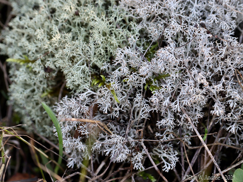 This reindeer lichen looked part green and part white. I first assumed it was a green reindeer lichen and the part greener was because some type of moss growing underneath that section. There are some sprouts of some type moss poking through the reindeer lichen in areas. Then I thought maybe the whiter section was a gray reindeer lichen just growing right next to a green reindeer lichen. Anyway I’m kind a confused on this one. What do you think? Do you think the green moss underneath part of it is just making it look greener and it is just an all green reindeer lichen or do you think the whiter section is a gray reindeer lichen just growing next to a green?