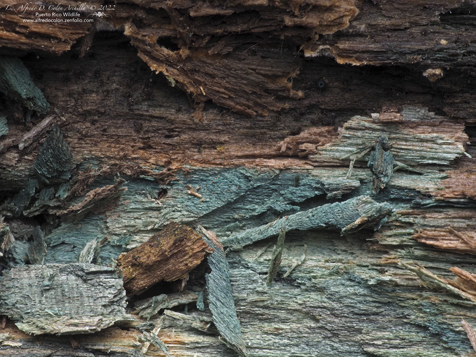 Wood infected with fungus Chlorociboria aeruginascens, the green elfcup, the green wood cup
