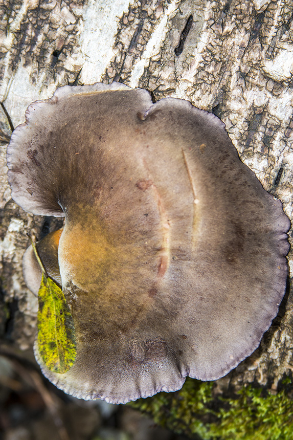 Late Oyster is a common, widespread, small to medium-sized, fleshy, shelf-like fungus. It is saprobic on decaying stumps and logs. It is found singly or in overlapping groups on the trunk or a large branch of a dead and decaying tree. It usually occurs on a hardwood, especially black cherry, but occasionally also on a conifer. It appears in the late fall with the onset of cold weather. There is often no stalk. If there is a stalk it is short, 3 ⁄16″ to ⅝″ long, thick, and laterally attached. It is yellow, brownish-white, or the same color as the cap, and is covered with velvety hairs. The cap is kidney-shaped or semi-circular and 13 ⁄16″ to 4″ in diameter. The color is variable, often on the same cap. When young it is downy and often flushed with violet. As it ages it becomes hairless and olive-green to yellowish-green. Eventually it turns yellowish-olive or light brown. When wet it is somewhat slimy or sticky to the touch (viscid). The margin is rolled inward and often lobed, indented, or wavy. As it ages the margin flattens out. The flesh is thick, white, and firm, and there is a gelatinous layer just below the skin (cuticle) of the cap. It is edible but has a mediocre taste and becomes bitter as it ages. There is no universal veil. The gills are narrow, close together and run down the stalk if there is one (decurrent) or broadly attached (adnate). They are bright orangish-yellow, yellowish-orange with a brown tinge, pale orange, or pale yellow at first, fading with age. The spore print is pale yellow. |